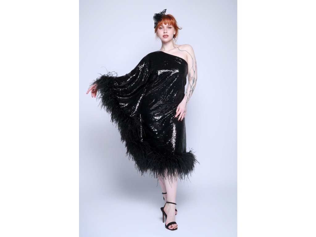 Výjimečné černé šaty The Dress ve velikosti M/L s flitry a peříčkovým zdobením, které jsou ideální pro galavečery a plesy.