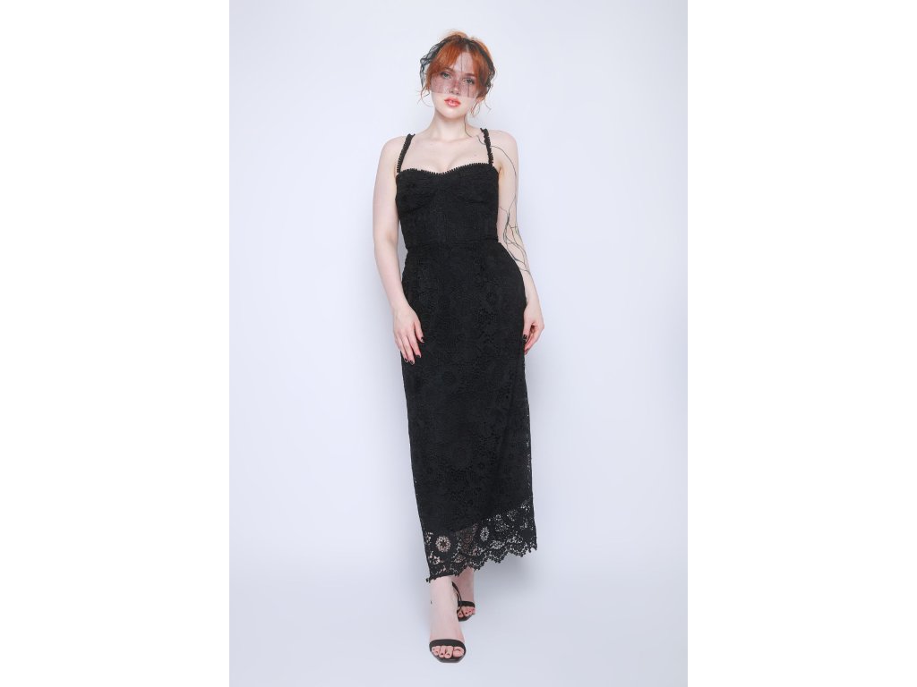 Romantické černé krajkové šaty Sabina Musayev, dostupné ve velikosti M/L, s jemným šněrováním na zádech, ideální pro večerní události.