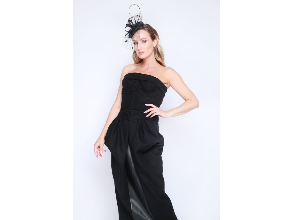 Originální černé šaty Maison Margiela, dostupné ve velikosti S/M, s odhalenými rameny a netradičním střihem, ideální pro umělecké akce.