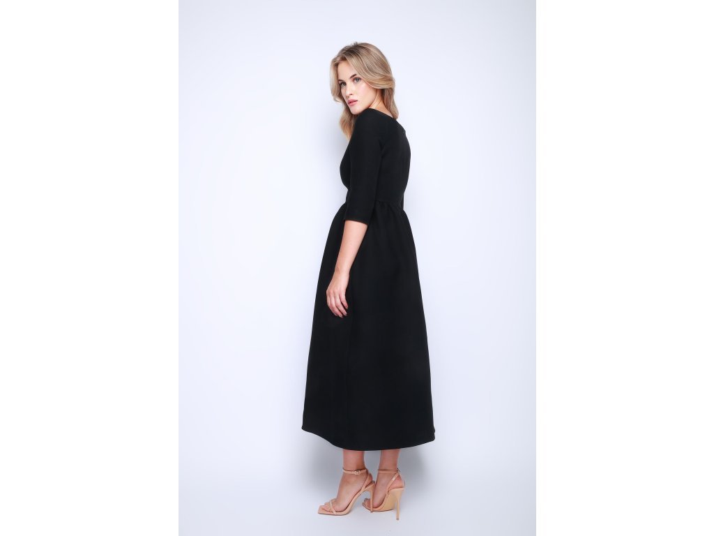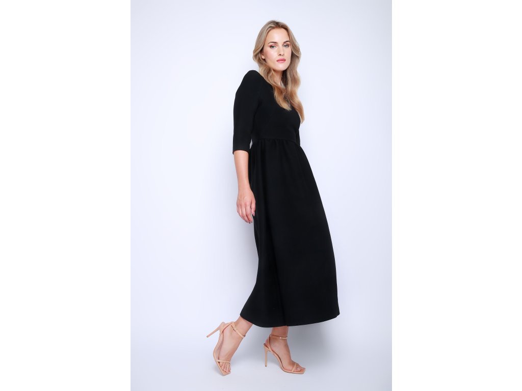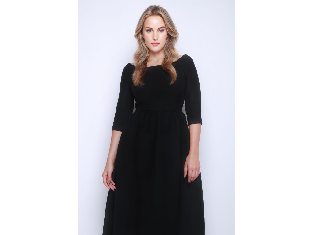 Černé midi šaty Christian Dior, velikost S/M, s lodičkovým výstřihem a tříčtvrtečními rukávy, ideální pro sofistikované denní i večerní události.