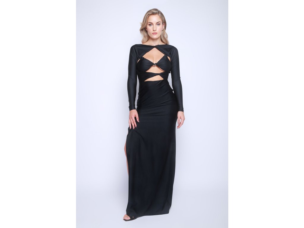 Černé maxi šaty Coperni, velikost S/M, s výraznými cut-out detaily v dekoltu a vysokými rozparky, ideální pro večerní akce.