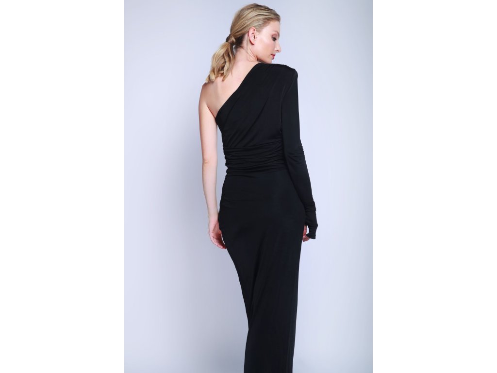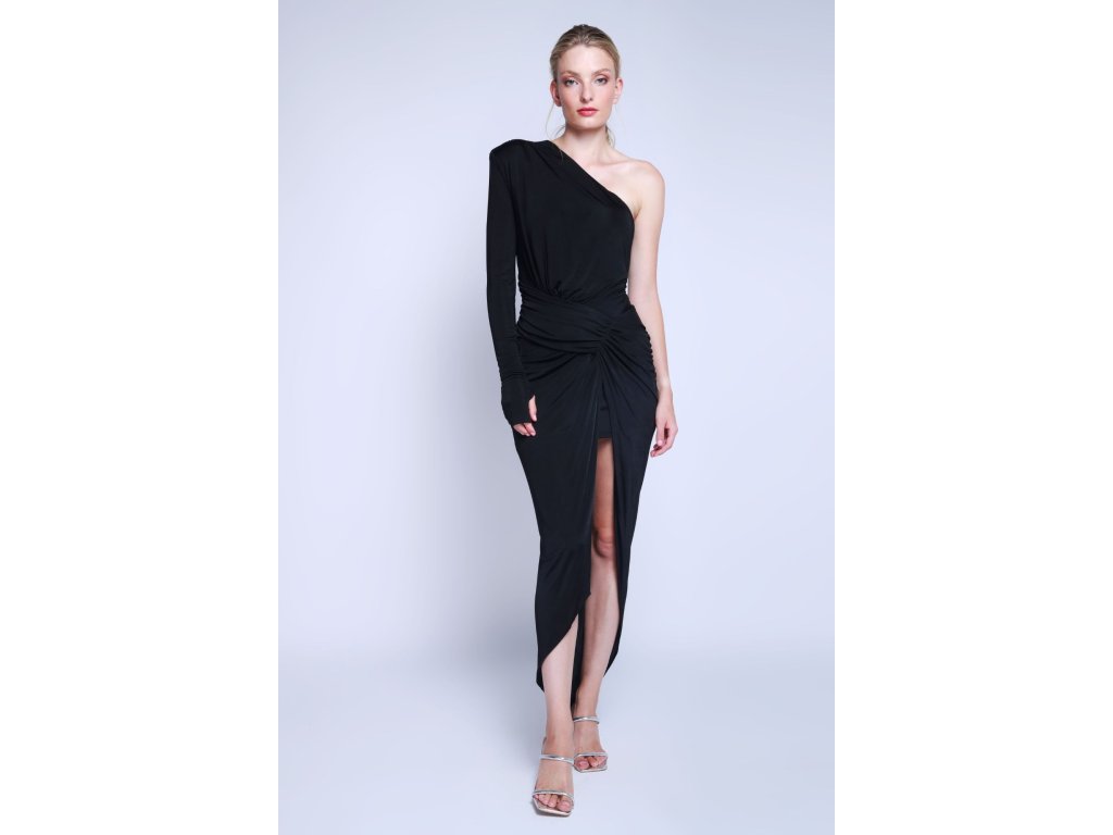 Černé midi šaty s jedním rukávem Pinko – elegantní koktejlový model s vysokým rozparkem.