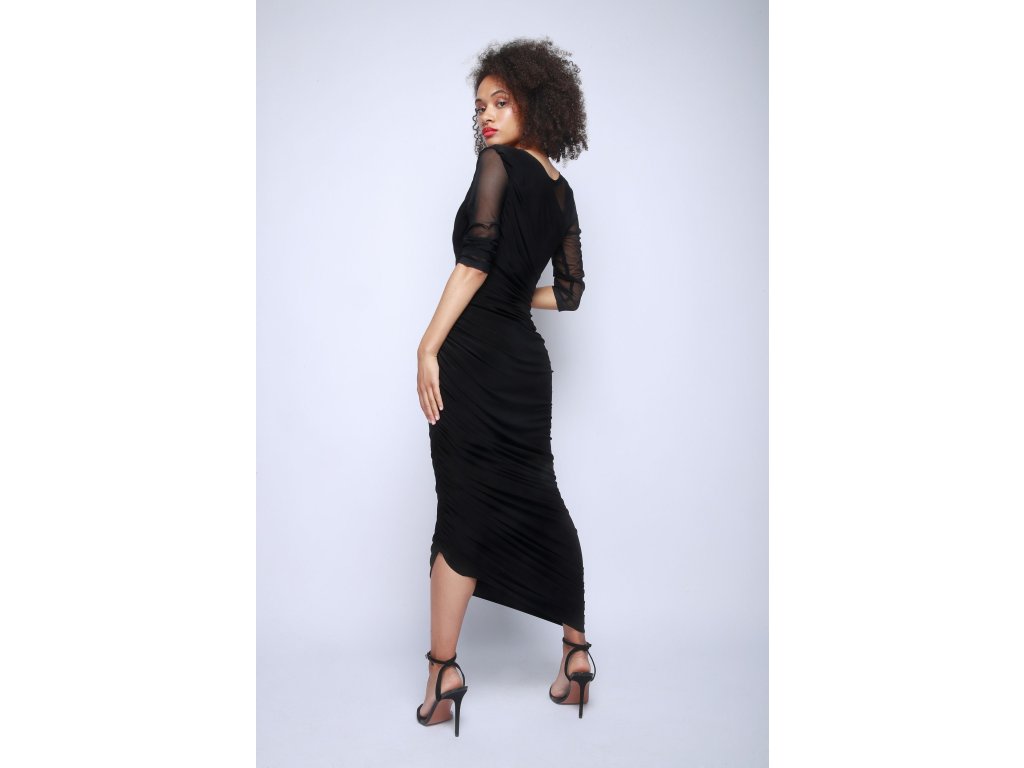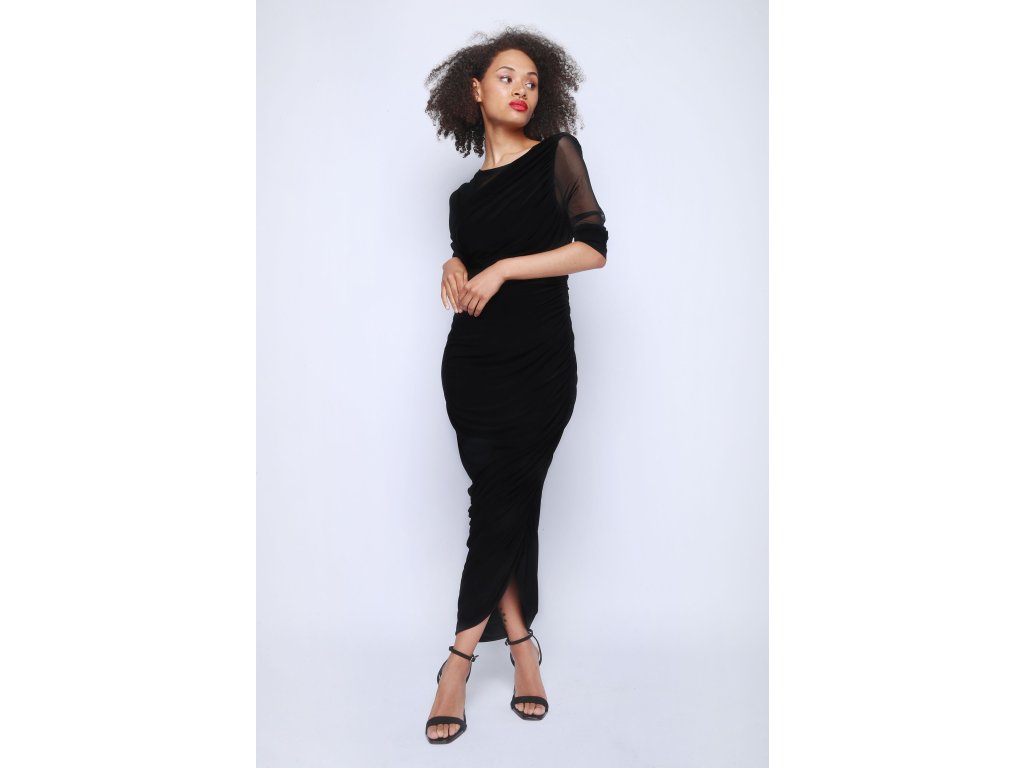 Elegantní černé šaty Norma Kamali s rafinovaným řasením a průsvitnými rukávy, které lichotí každé postavě.