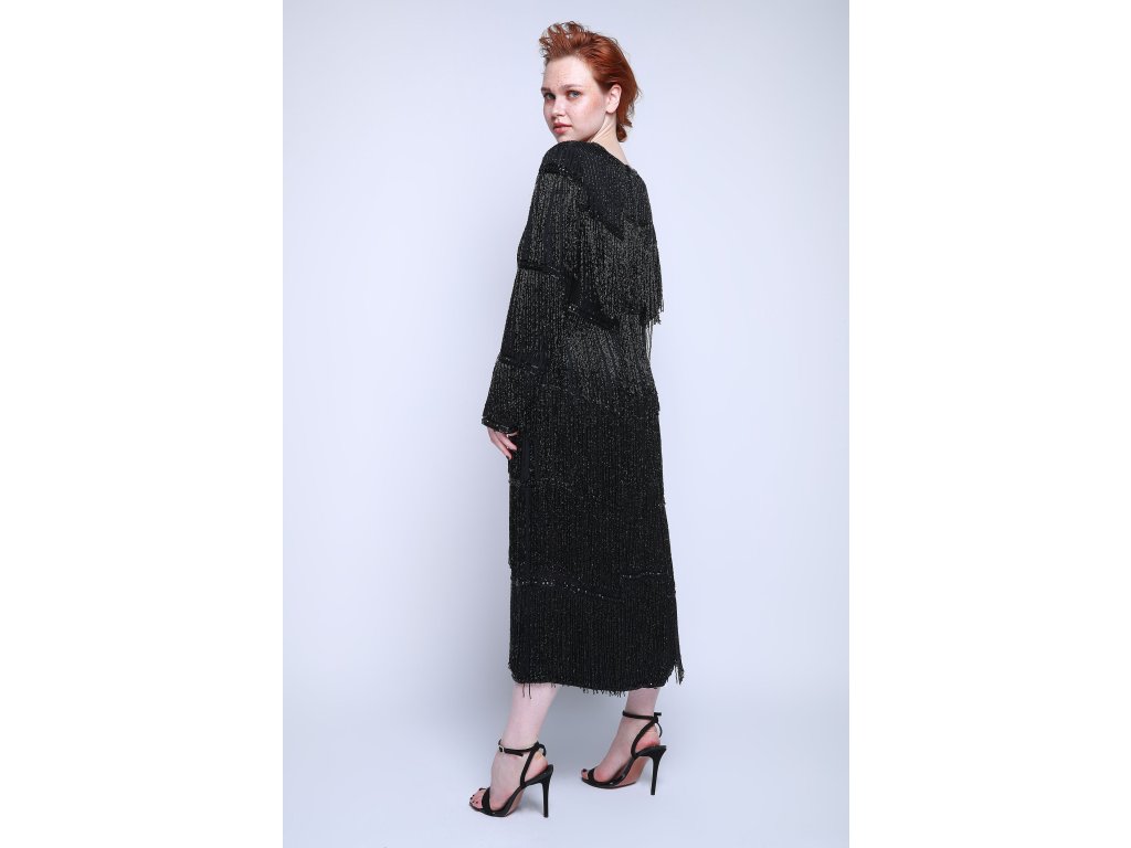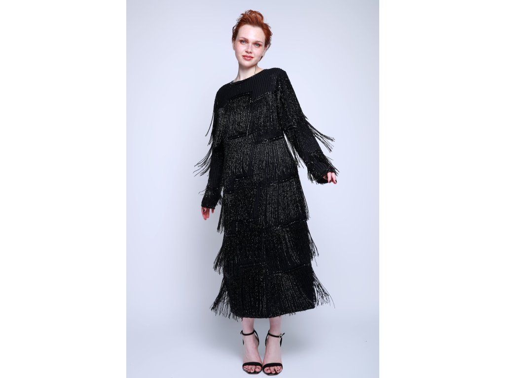Okouzlující šaty The Dress s výraznými třásněmi a decentním leskem, které jsou perfektní pro večírky a slavnostní události.
