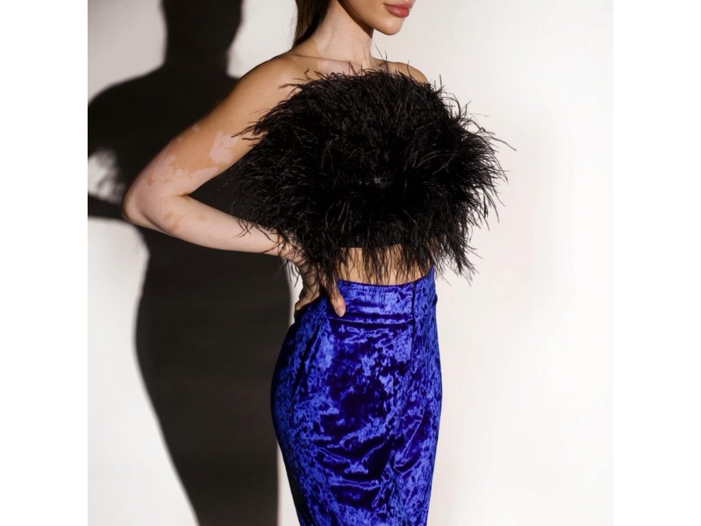 Černý top z pavího peří HoneyB by Biasiol S/M – výrazný cocktail kousek pro odvážné kombinace.