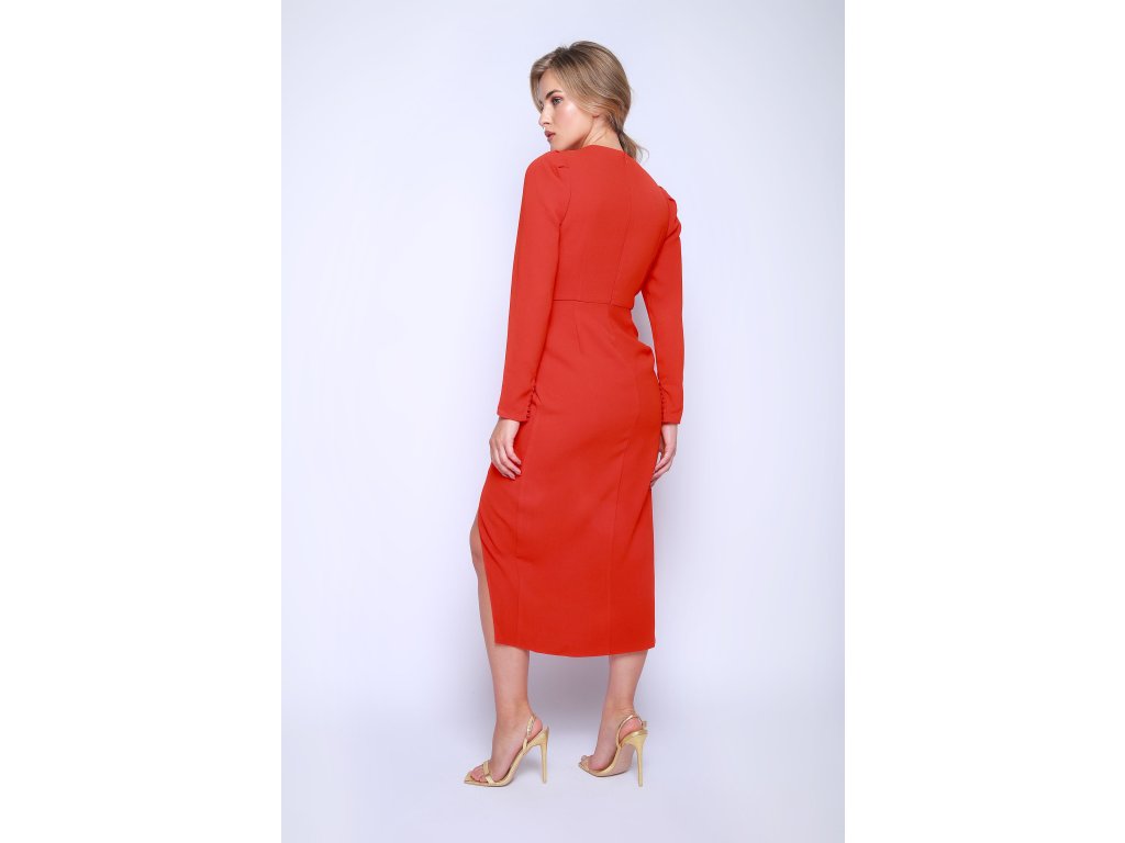 Výrazné červené šaty Self-Portrait ve velikosti S/M s asymetrickým řasením a rozparkem, ideální pro slavnostní večeře.