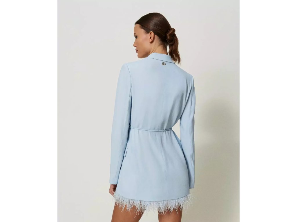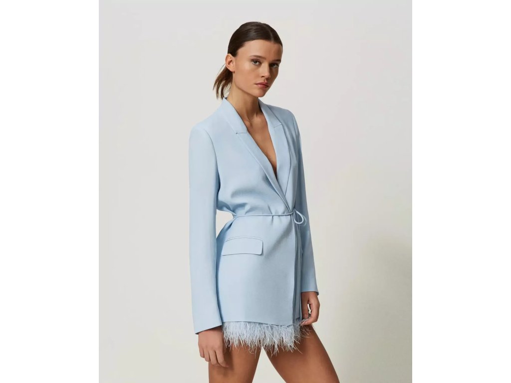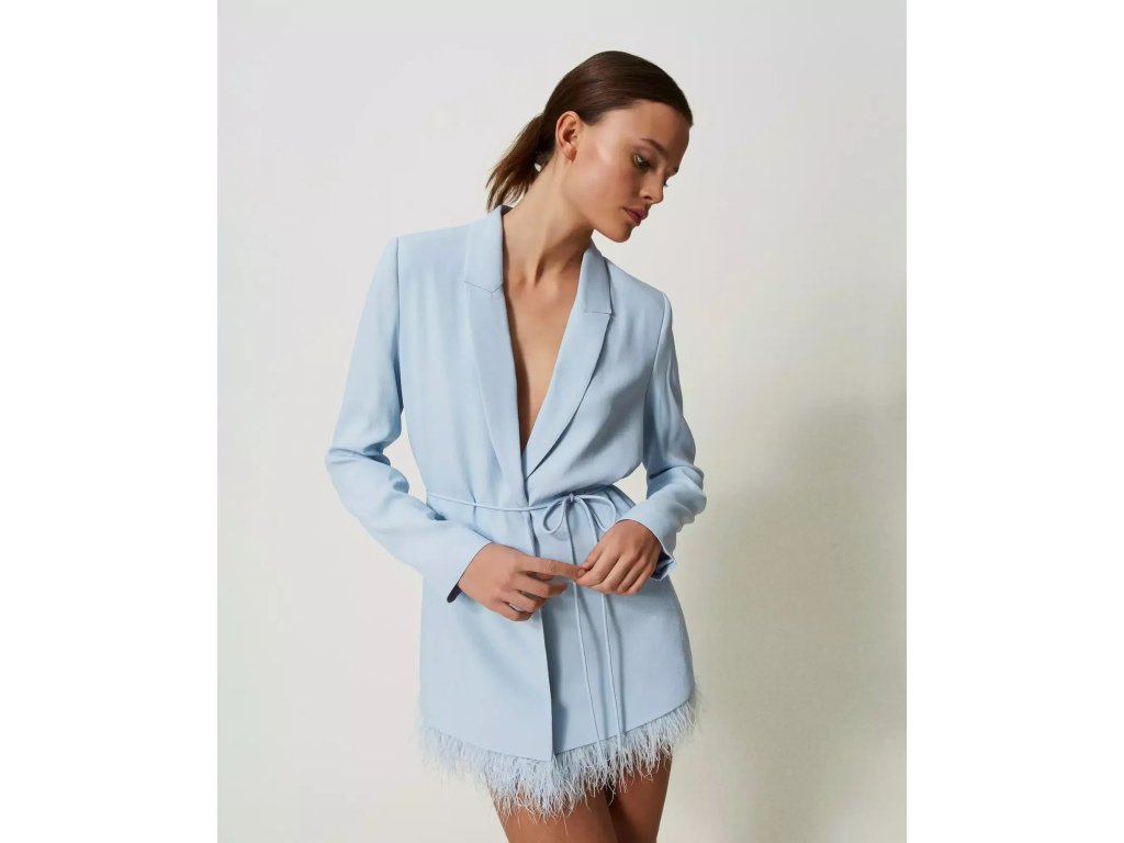 Elegantní světle modré sako s páskem a ozdobným peřím, které je ideální pro letní party nebo speciální příležitosti.