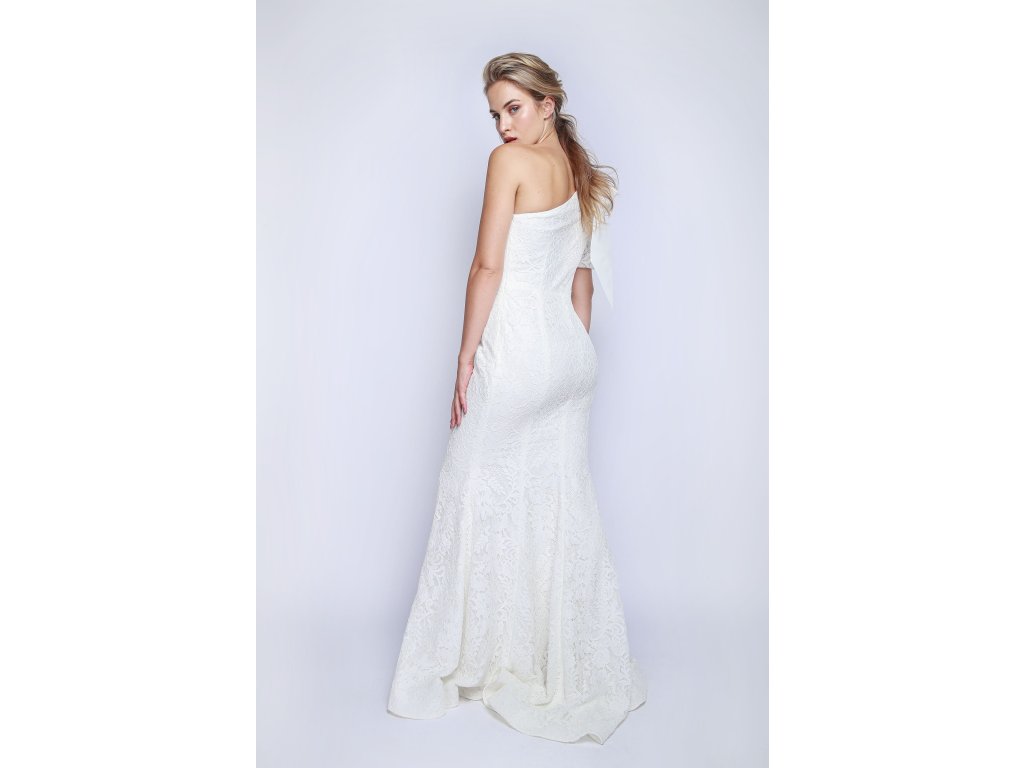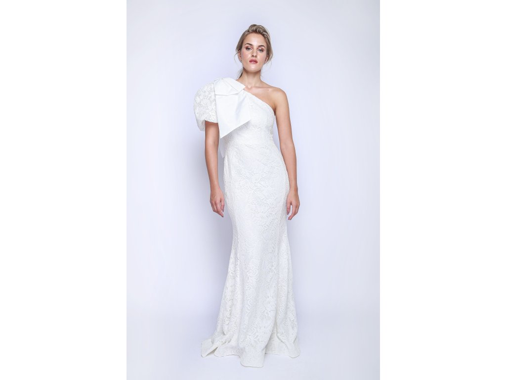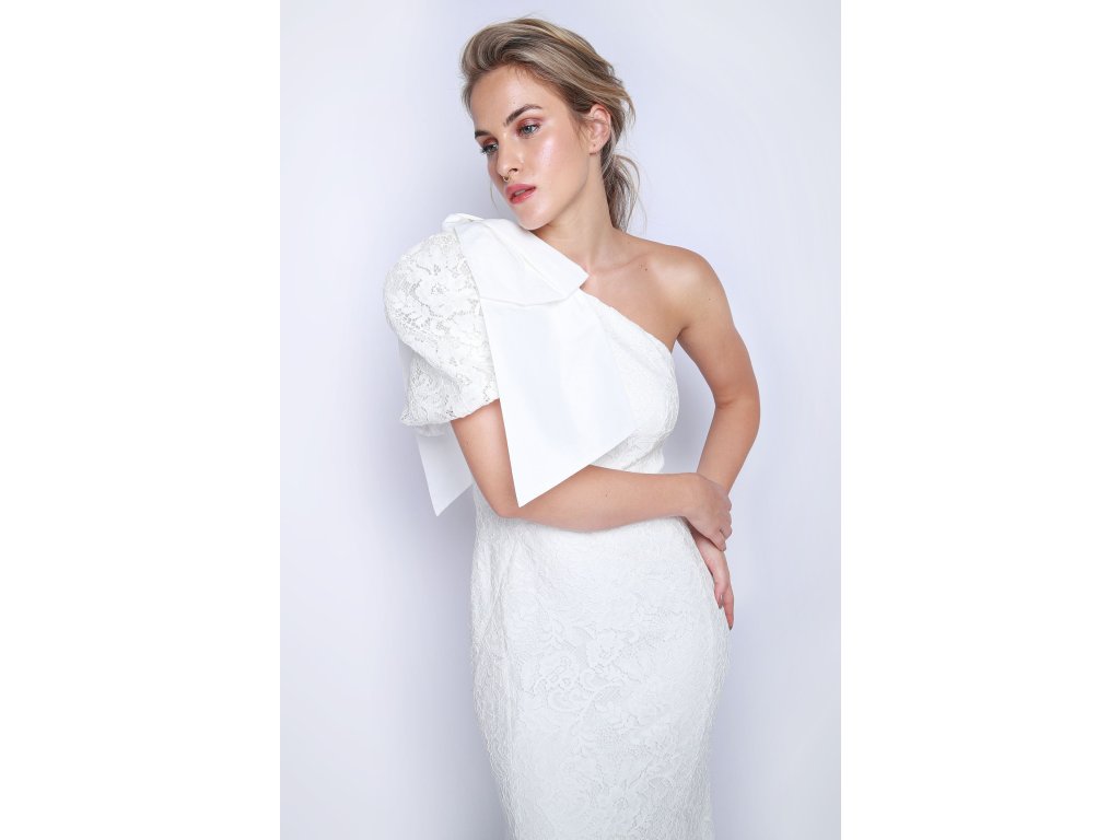 Originální bílé šaty Rebecca Vallance ve velikosti S/M s asymetrickým střihem na jedno rameno, kterému dominuje výrazná a elegantní mašle.
