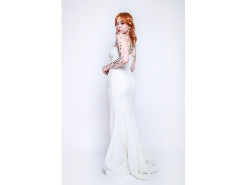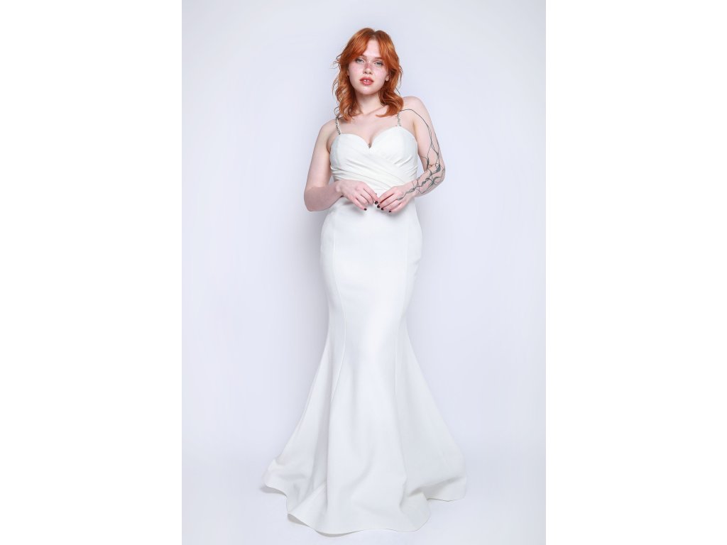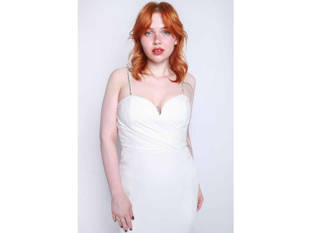 Okouzlete v těchto dechberoucích bílých maxi šatech od Rebecca Vallance, které jsou ztělesněním moderní elegance. Jejich lichotivý střih do mořské panny dokonale obepíná postavu a rozšiřuje se do dramatické sukně, která vytváří nezapomenutelnou siluetu. Šaty zdobí tenká, elegantní ramínka s řetízkovým detailem, který dodává celkovému vzhledu punc luxusu a originality. Vyrobeny z prvotřídního materiálu, který zajišťuje komfort a perfektní padnutí. Tyto šaty ve velikosti S/M jsou ideální volbou pro nevěsty hledající sofistikovanost a jedinečnost pro svůj velký den, nebo pro dámy toužící po oslnivém vzhledu na nejpřísnějších formálních událostech.
