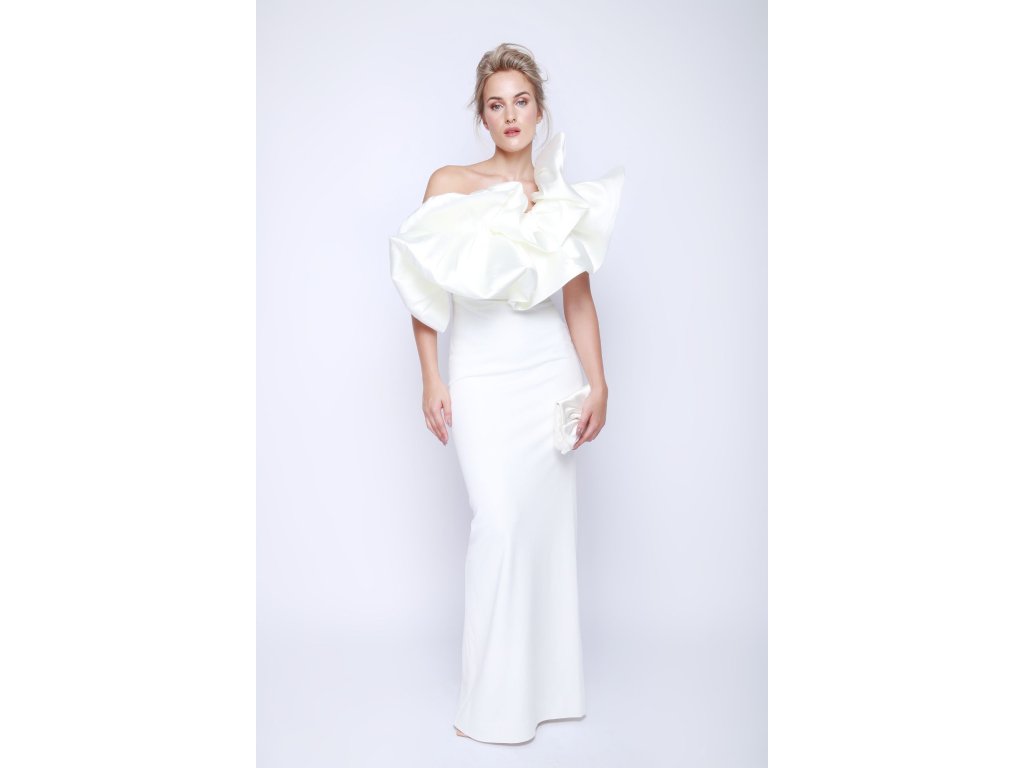 Originální bílé šaty Solace London ve velikosti S/M s výrazným sochařským volánem na rameni, které okamžitě upoutají pozornost.
