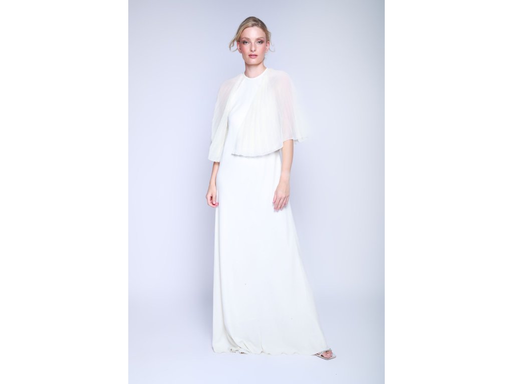 Elegantní šaty Zeus Dione ve velikosti S/M s unikátní splývavou pelerínou, které dodávají celému vzhledu lehkost a éterický ráz.