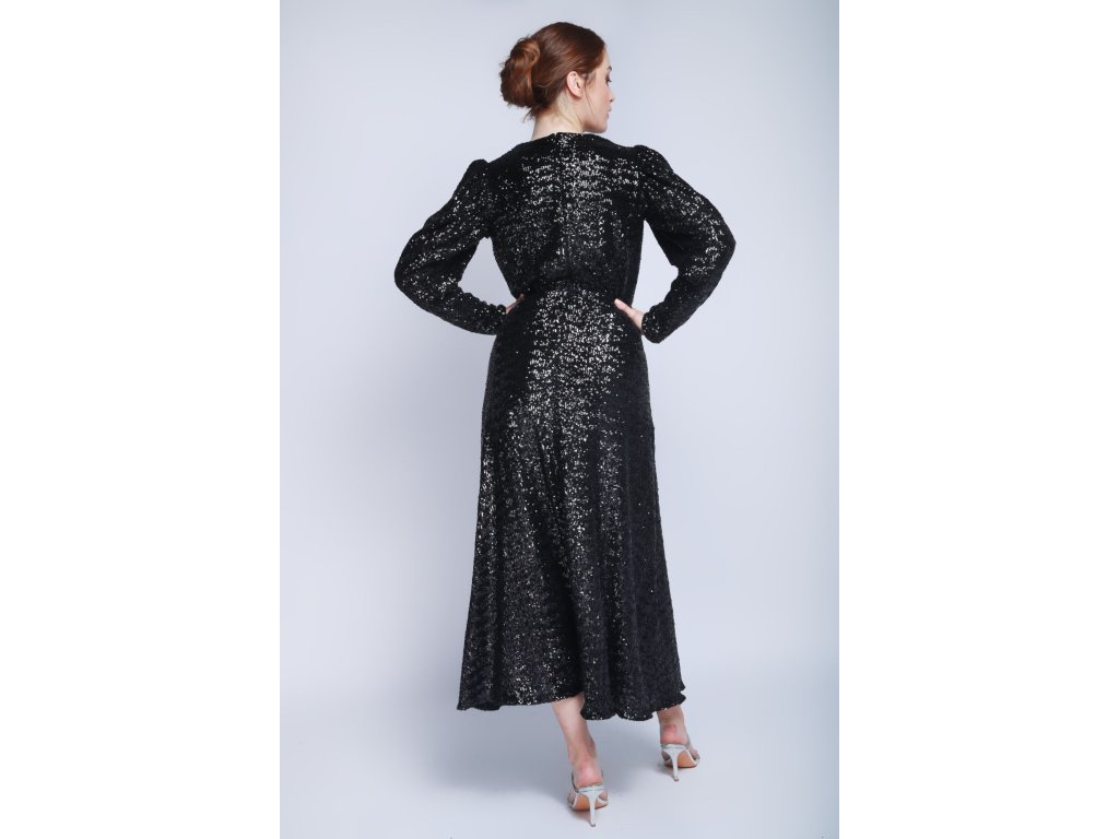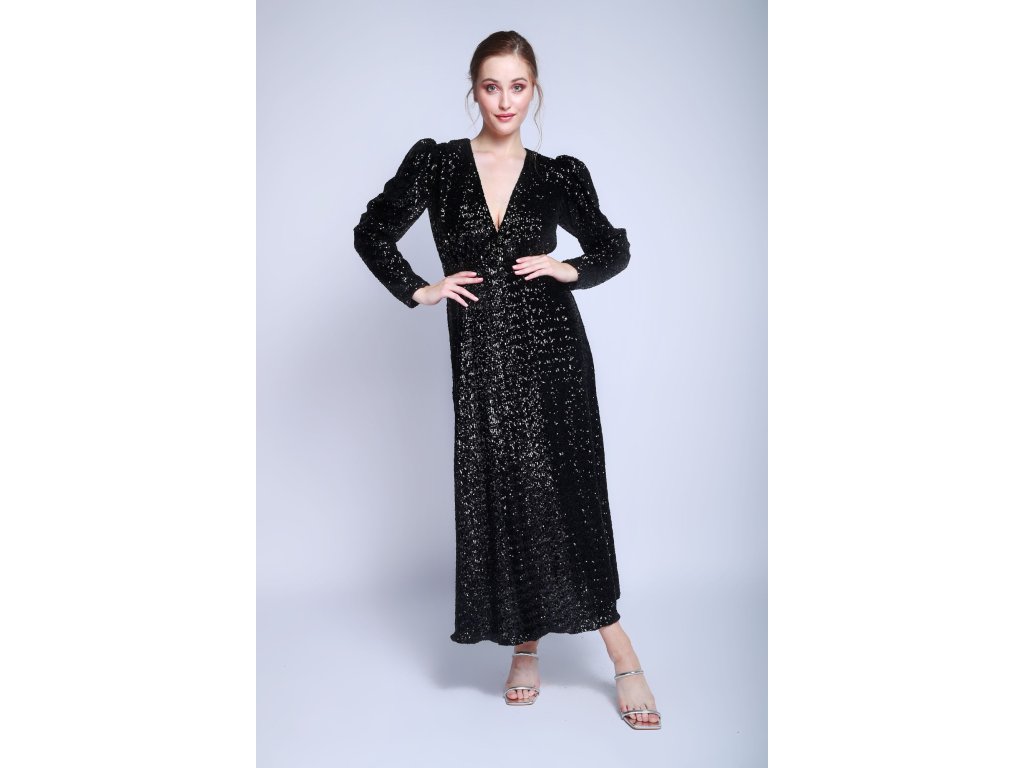 Tyto černé šaty od značky Borgo de Nor, dostupné ve velikosti M/L, jsou ztělesněním moderního glamouru. Jejich střih s V-výstřihem a zvýrazněným pasem lichotí postavě, zatímco třpytivý povrch dodává šatům jedinečný a slavnostní ráz. Dlouhé, objemné rukávy podtrhují eleganci a styl. Tyto šaty jsou ideální volbou pro koktejlové večírky, plesy nebo jiné události, kde chcete zazářit a působit sebevědomě.