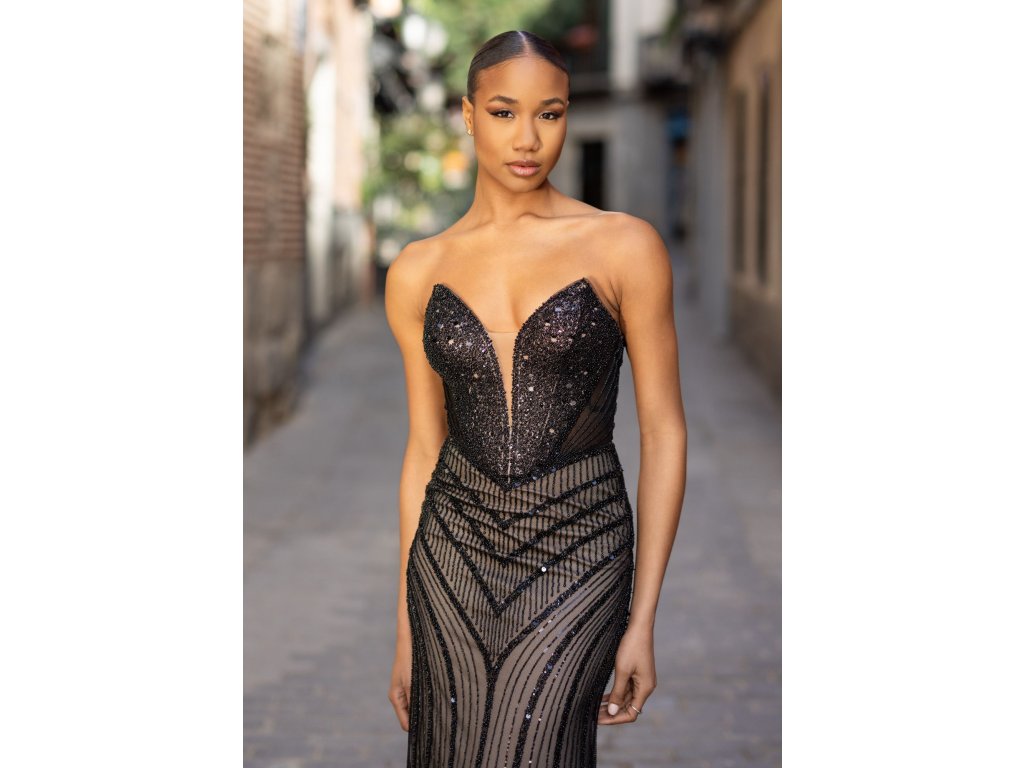 Tyto černé šaty od značky Christian Koehlert, dostupné ve velikostech XS a L, jsou ztělesněním nadčasového glamouru. Jejich přiléhavá silueta ve stylu mořské panny s korzetovým živůtkem a rafinovaným výstřihem dokonale zvýrazní postavu. Jemná síťovaná sukně je bohatě zdobena třpytivými detaily, které vytvářejí elegantní a poutavý vzor. Jsou ideální volbou pro formální galavečery, plesy nebo jiné slavnostní události.