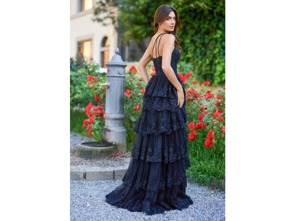 Tyto černé šaty od značky Christian Koehlert, dostupné ve velikosti M/L, jsou ztělesněním dramatického a luxusního stylu. Asymetrický střih s odhaleným ramenem a bohatá, vrstvená sukně vytvářejí působivou siluetu. Vrchní část šatů je zdobená elegantní krajkou a drobnými třpytivými detaily, zatímco sukně se skládá z volánů, které dodávají šatům objem a pohyb. Jsou ideální volbou pro formální události, plesy nebo jiné výjimečné příležitosti, kde chcete zazářit.