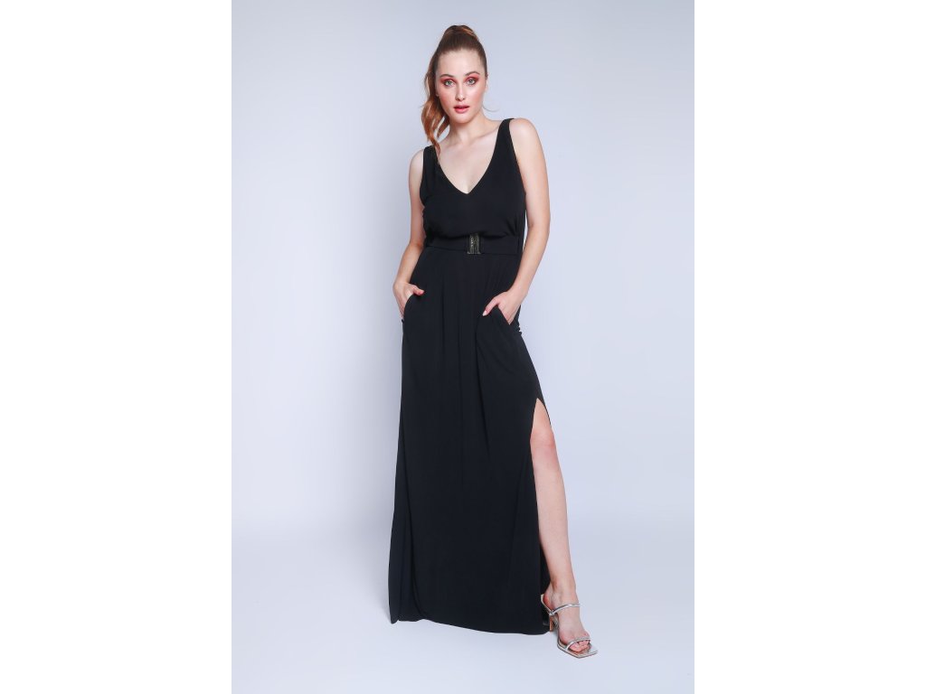 Elegantní černé šaty Pinko ve velikosti M/L s V-výstřihem, páskem v pase a objemnou sukní s bočním rozparkem.