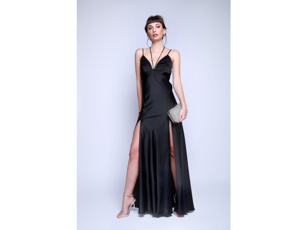 Elegantní černé šaty Pinko ve velikosti XS/S z lesklého saténu s dvěma smyslnými rozparky, které dodají vašemu vzhledu luxusní ráz.