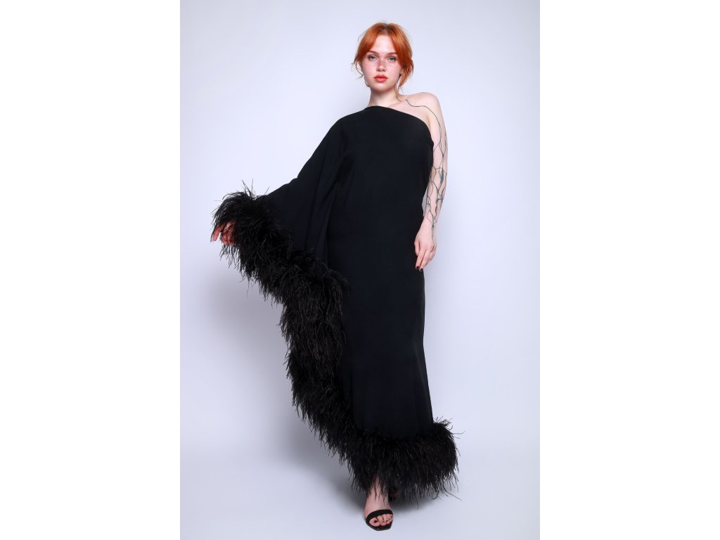 Černé maxi šaty Taller Marmo zdobené peříčky, elegantní volba pro večery s dress codem black tie.