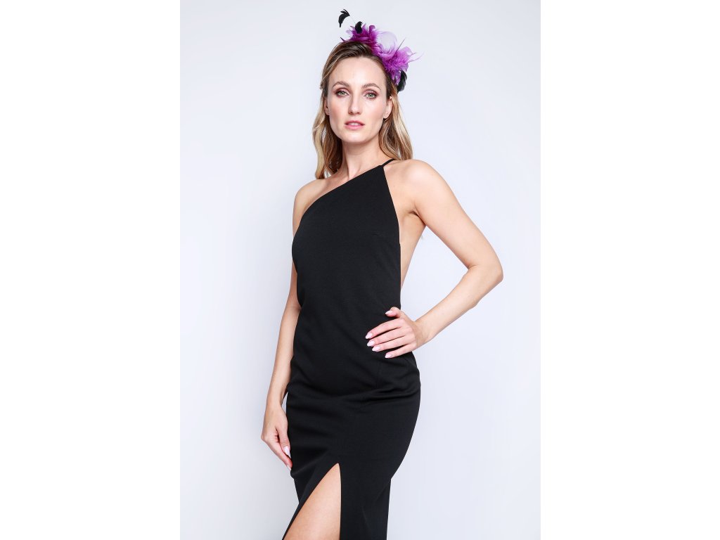 Dlouhé černé šaty Solace London s jedním ramínkem a rozparkem. K dispozici ve velikosti S/M, ideální pro večerní akce s dress codem Black tie.