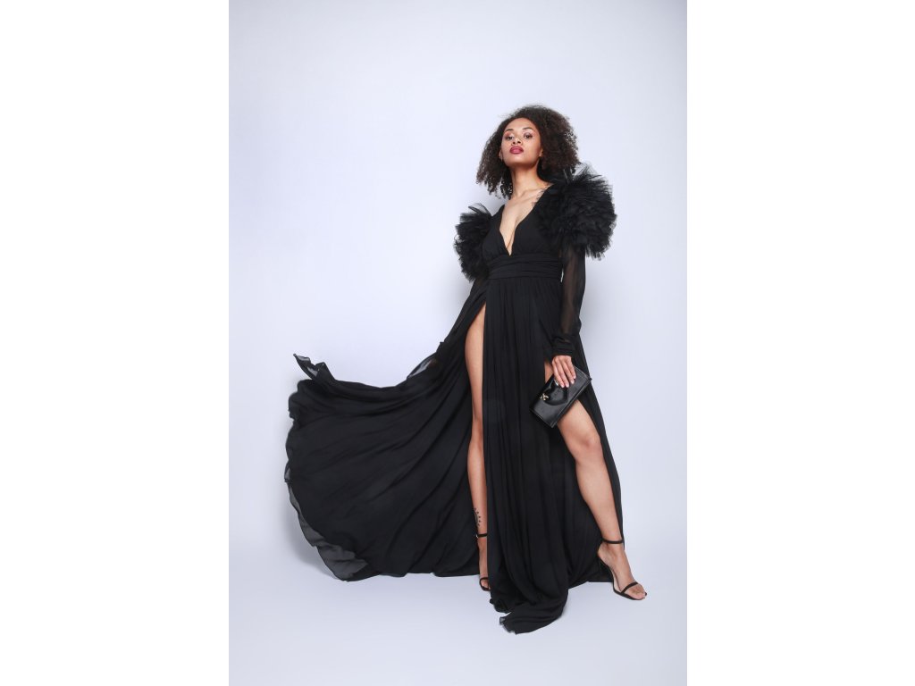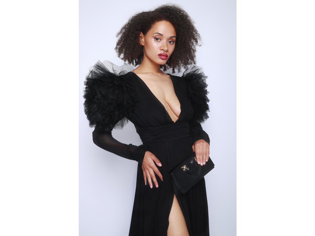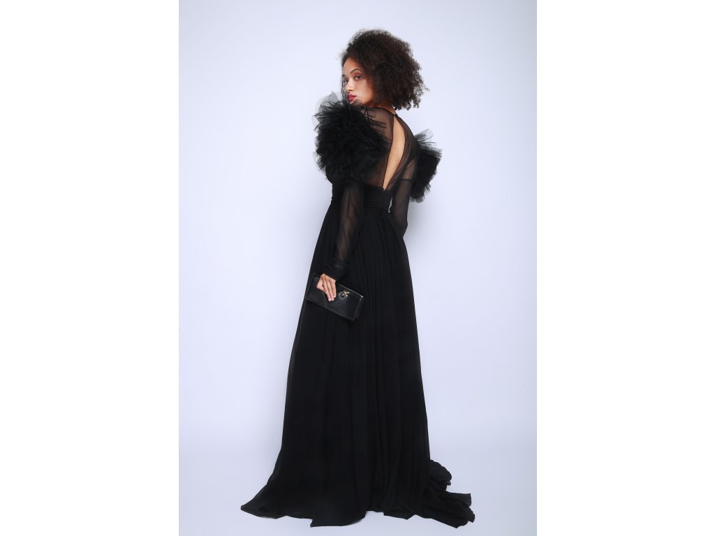 Dlouhé černé šaty s ozdobnými rameny Pinko