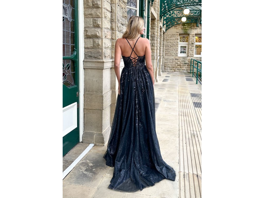 Luxusní černé třpytivé šaty s flitry a vysokým rozparkem. Okouzlující volba pro ples nebo gala večer, ve které se stanete středem pozornosti.