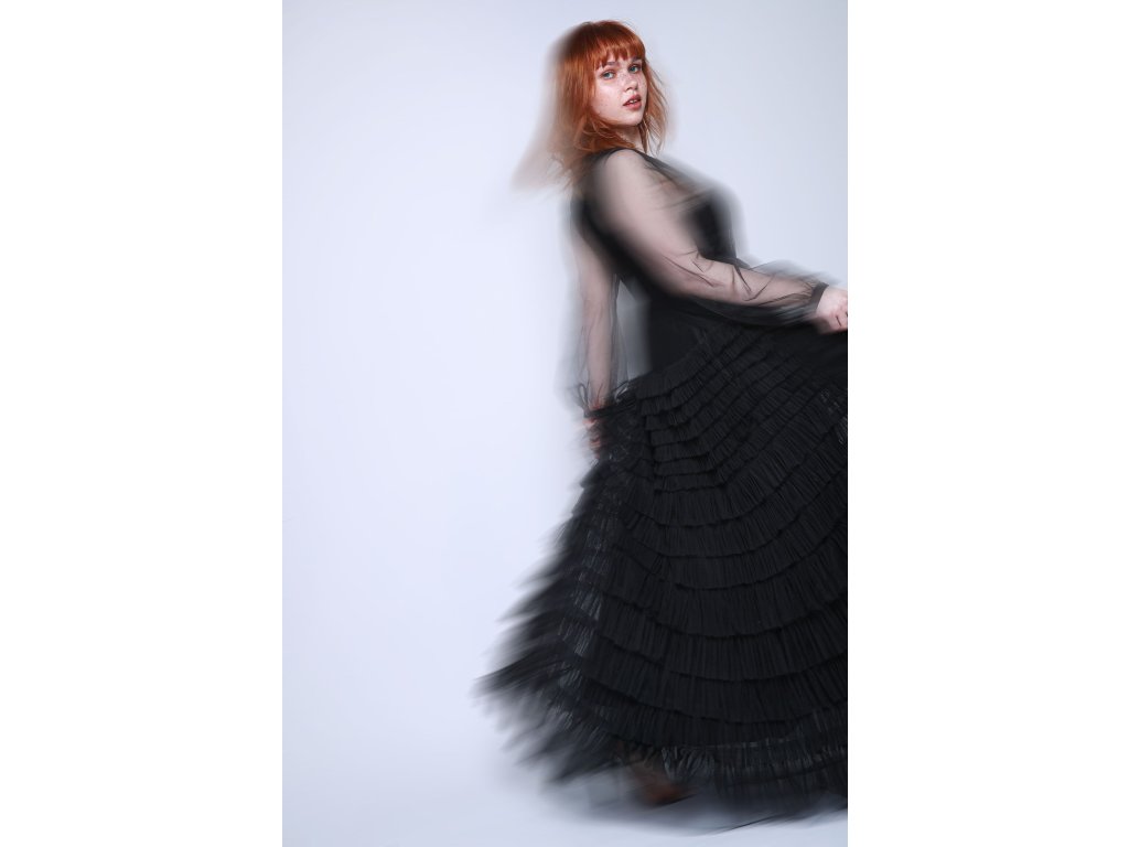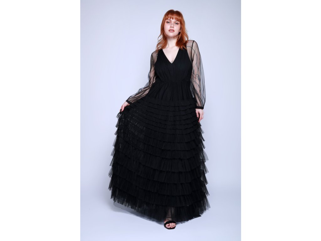 Černé maxi šaty Twinset s výraznými volány a průhlednými rukávy, ideální pro black tie akce.
