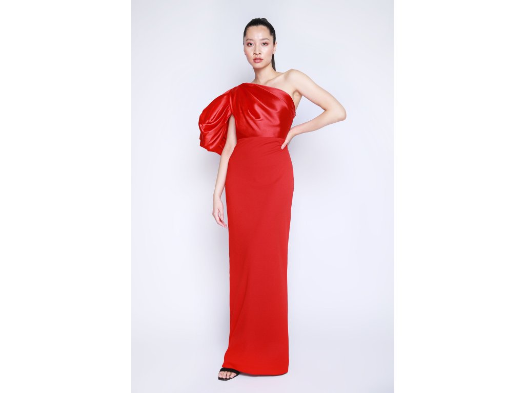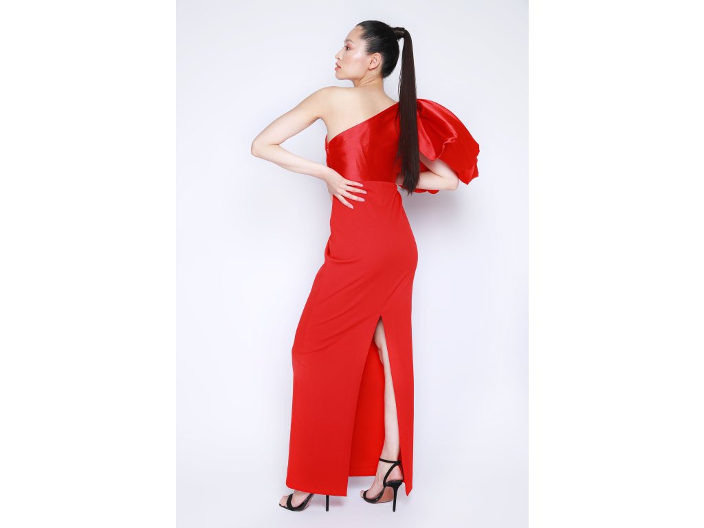 Elegantní dlouhé červené maxi šaty Solace London s výrazným balónovým rukávem. Velikost M/L, ideální pro Black tie události.