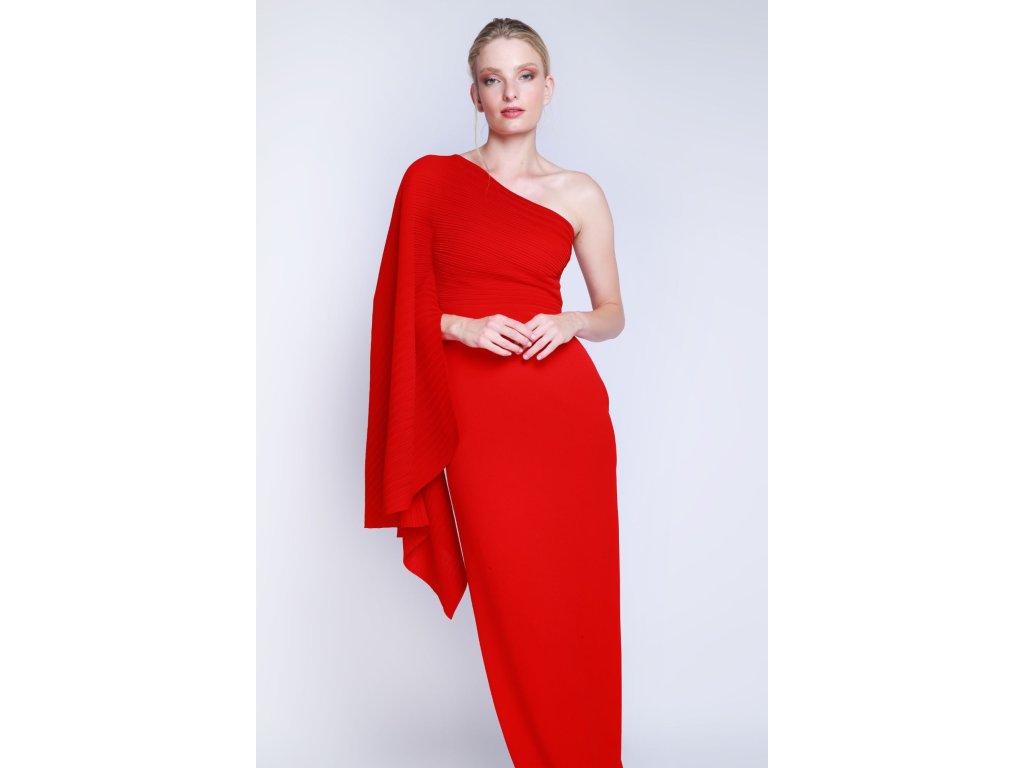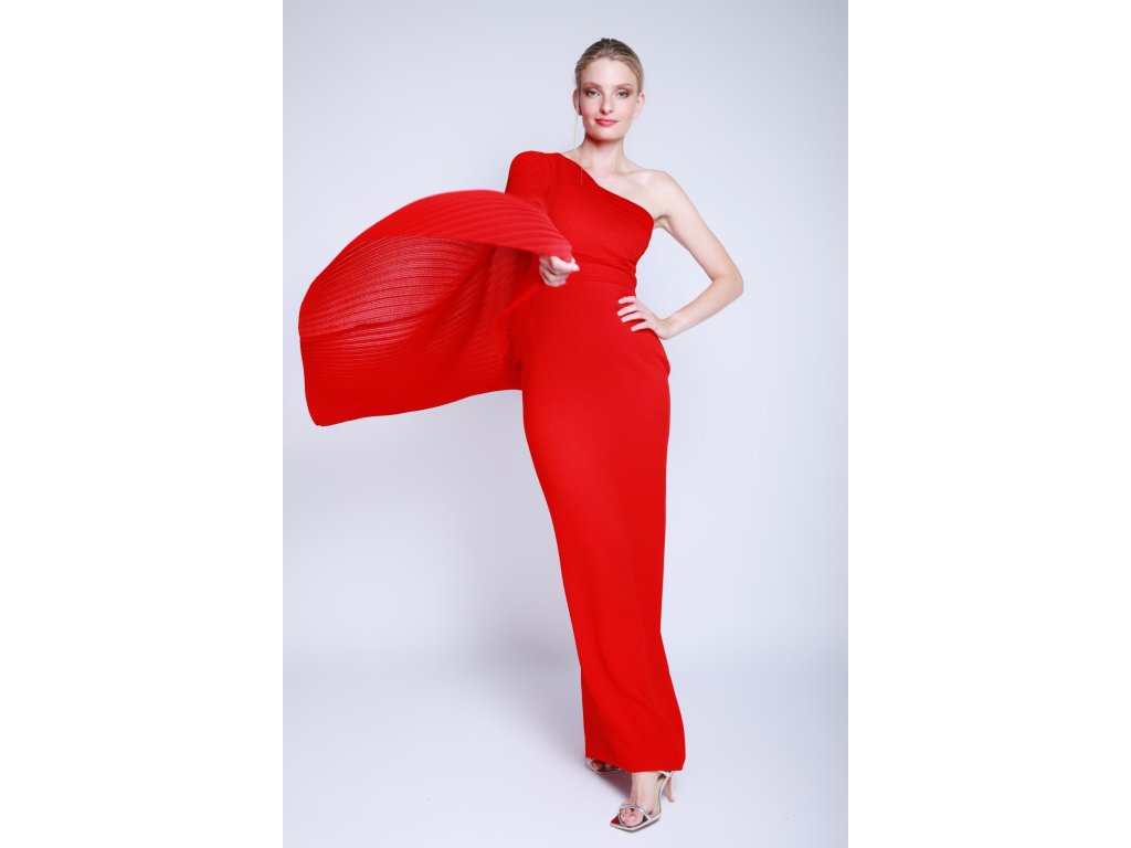 Výrazné dlouhé červené maxi šaty Solace London s asymetrickým ozdobným rukávem. Velikost S/M, ideální volba pro White tie události.