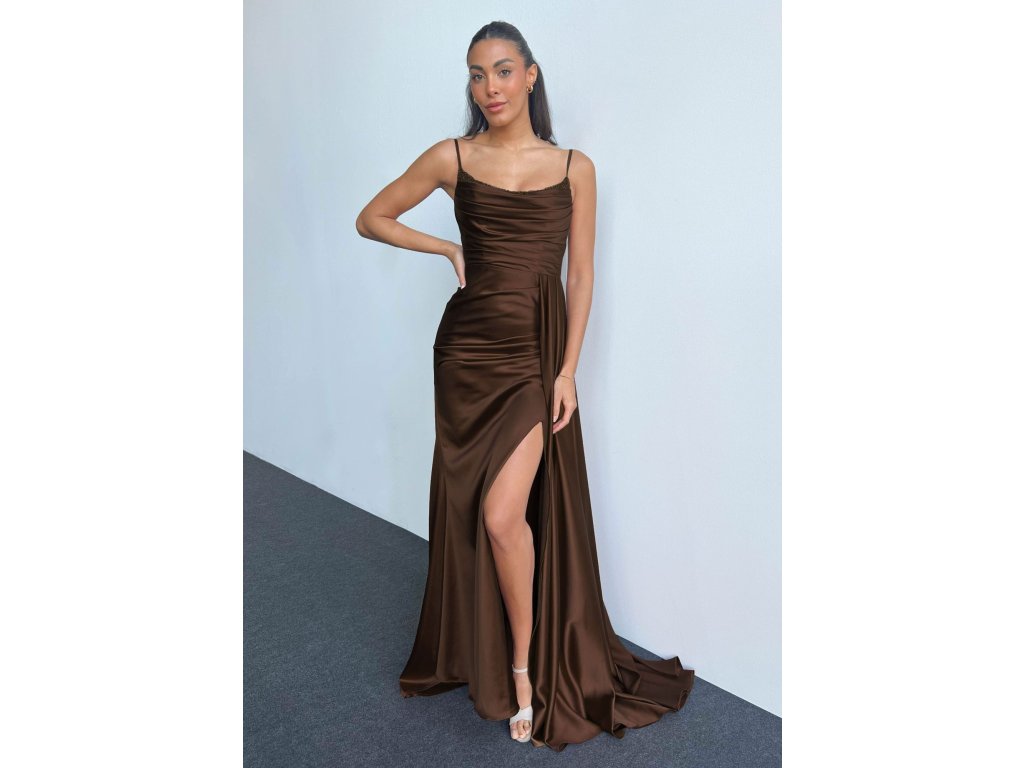 Dlouhé hnědé šaty Christian Koehlert v M/L. Luxusní střih, vysoký rozparek a elegance, která okouzlí na první pohled.