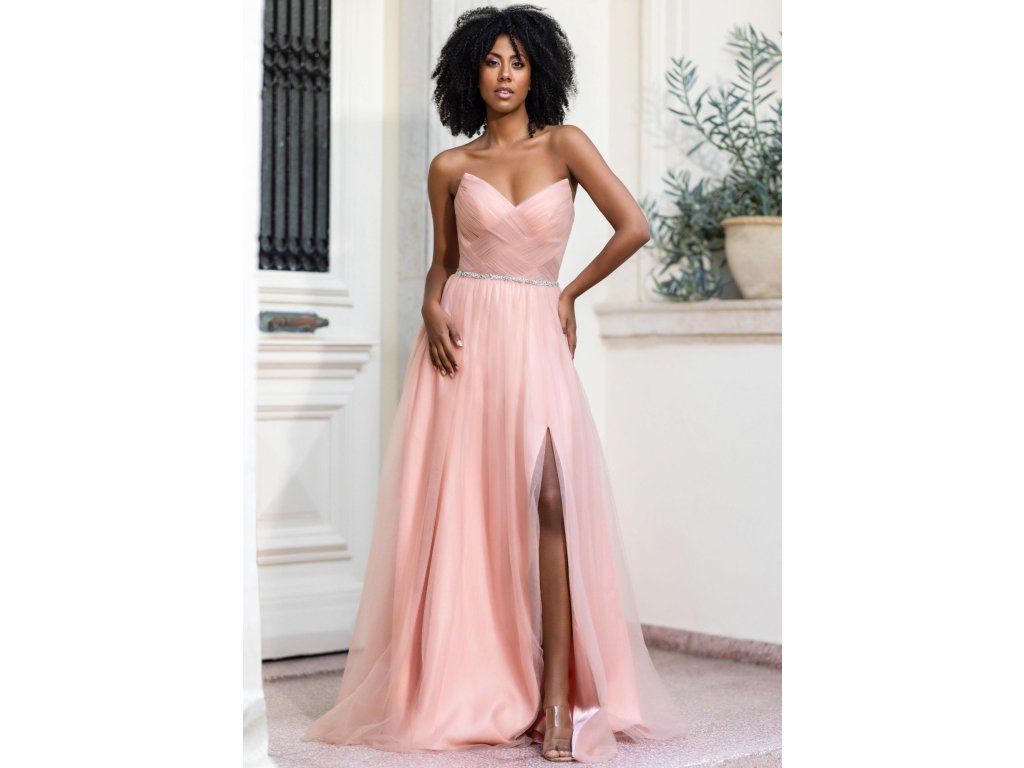 Dlouhé světle růžové společenské šaty ve velikosti S/M. Objemná sukně, jemný korzetový střih a rozparek pro elegantní look na akce s dress codem black tie.