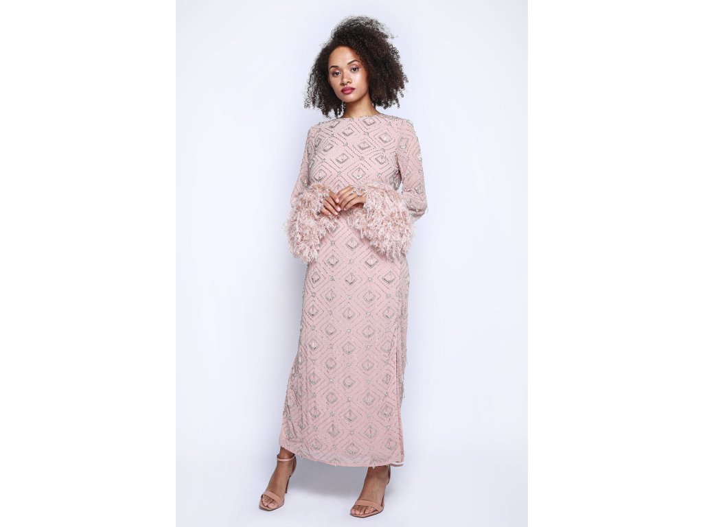 Dlouhé pudrové šaty The Dress s peříčky ve velikosti S/M. Elegantní kousek, který kombinuje jemnou barvu a luxusní zdobení.