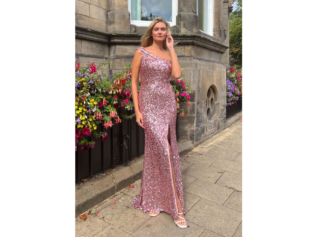 Dlouhé růžové flitrové šaty ve velikosti S/M. Elegantní střih s rozparkem a oslnivým třpytem, ideální pro plesy a večírky s dress codem cocktail nebo black tie creative.