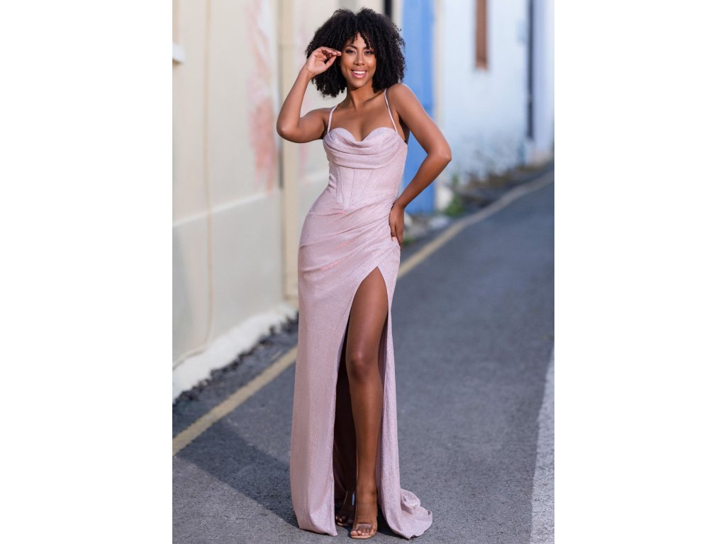 Dlouhé růžové třpytivé korzetové šaty ve velikosti XS/S. Elegantní střih s rozparkem a korzetem, ideální pro plesy a galavečery s dress codem black tie.