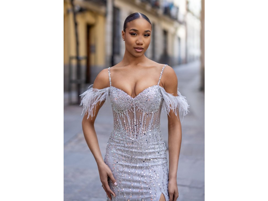 Dlouhé stříbrné šaty Christian Koehlert ve velikosti XS/S jsou skutečným klenotem mezi společenskými modely. Elegantní střih s odhalenými rameny doplňují jemná peříčka, která působí originálně a dodávají šatům šmrnc. Celý model je posetý třpytivými kamínky, díky nimž budete zářit při každém pohybu. Smyslný rozparek dodává šatům odvážný, ale stále noblesní charakter. Tento model je dokonalou volbou pro galavečery, plesy či exkluzivní akce s dress codem black tie, kde zanechá nezapomenutelný dojem.