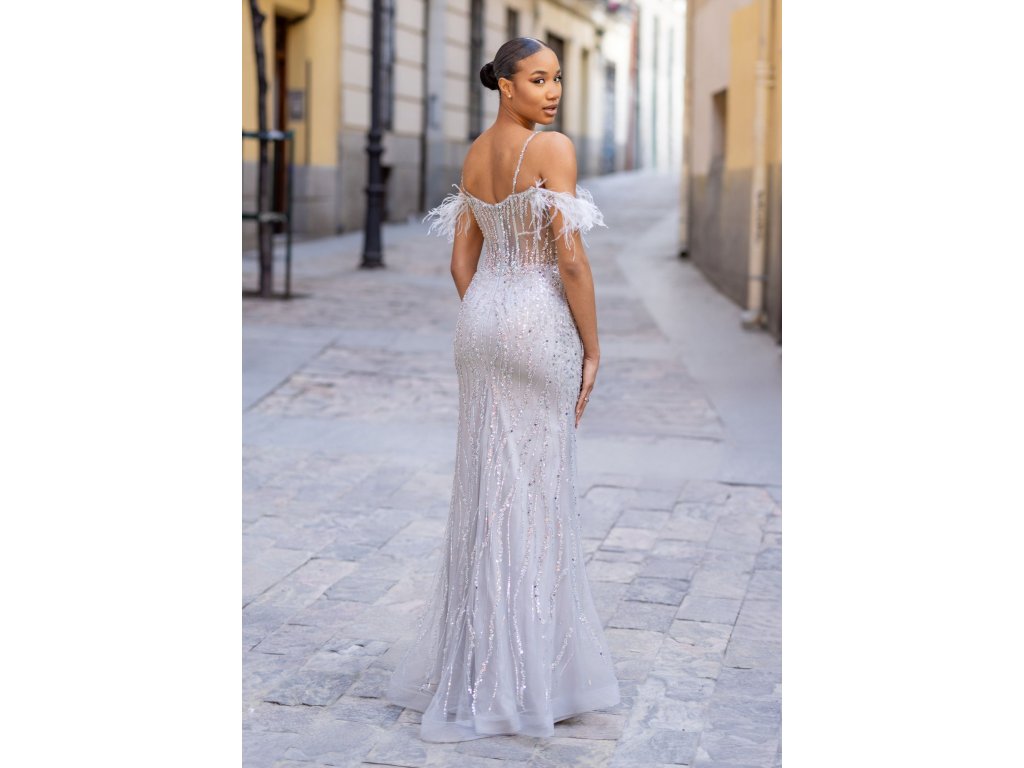 Dlouhé stříbrné šaty s kamínky a peříčky Christian Koehlert
