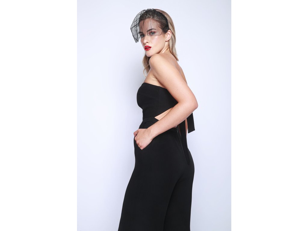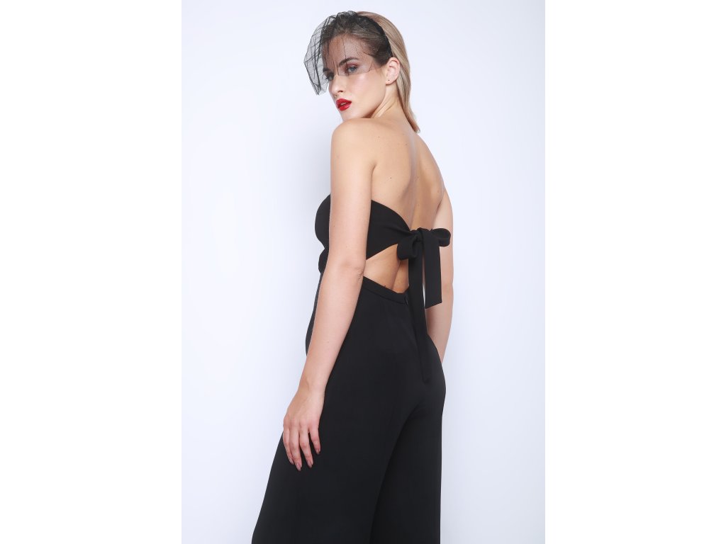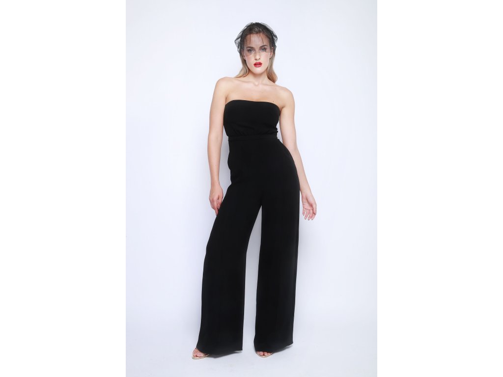 Dlouhý černý overal Valentino ve velikosti S/M okouzlí čistou elegancí. Nadčasový střih bez ramínek a široké nohavice podtrhnou ženskou siluetu.