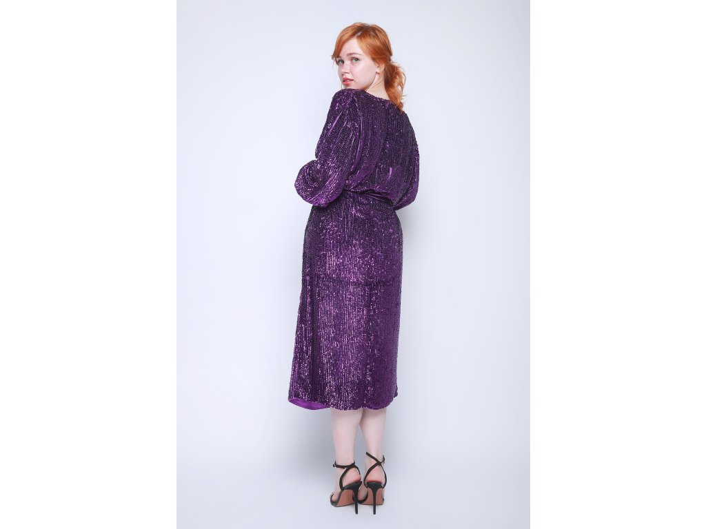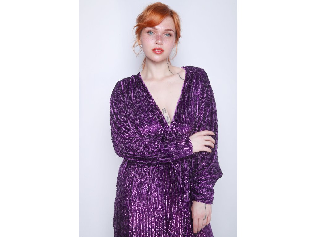Fialové flitrové midi šaty The Dress ve velikosti XL/XXL. Elegantní střih a třpytivý lesk ideální pro večírky a koktejlové události.