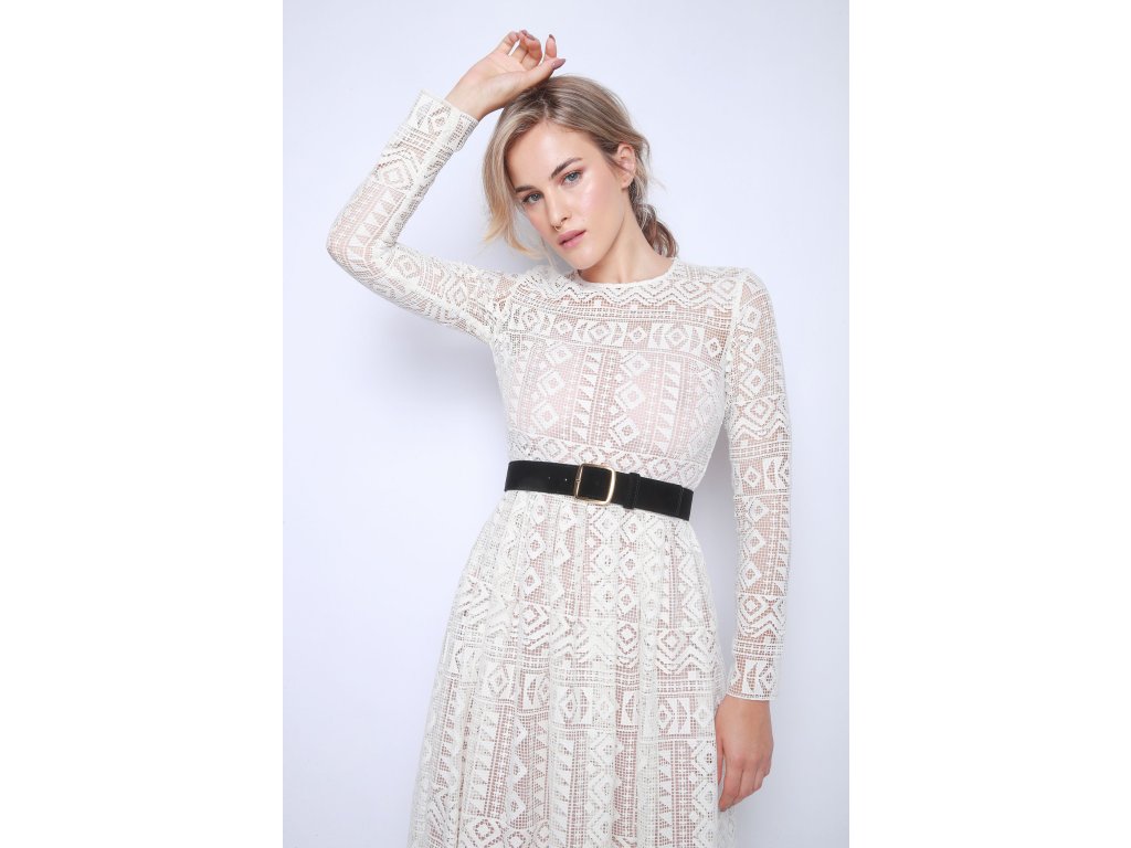 Romantické krajkové šaty značky Philosophy ve velikosti XS/S s dlouhými rukávy, vysokým výstřihem a elegantním páskem, který podtrhne vaši postavu.