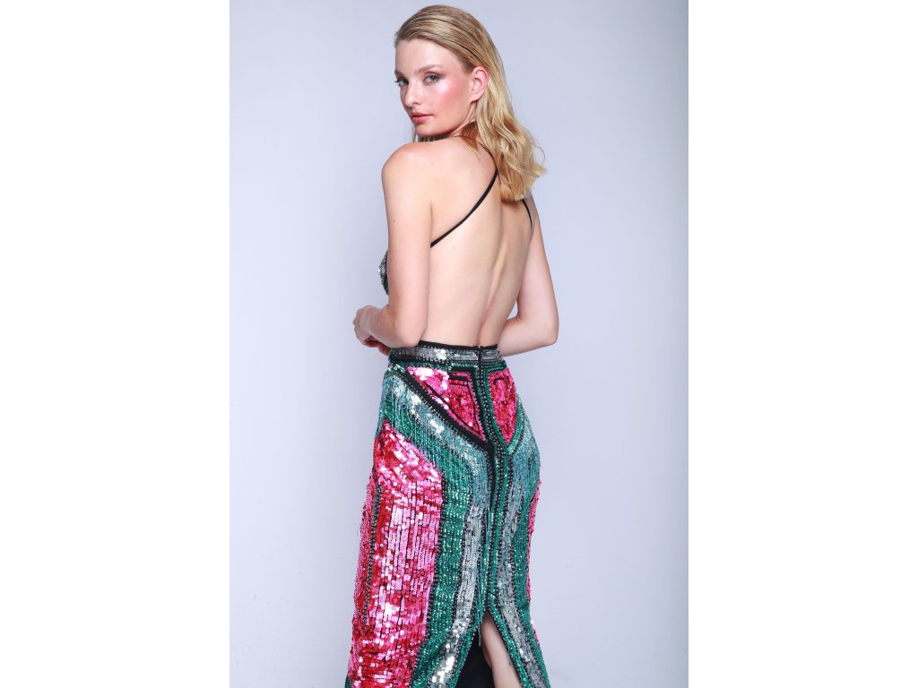 Flitrované barevné asymetrické šaty The Dress ve velikosti XS/S zaujmou svou originalitou a odvahou. Midi střih s asymetrickým zakončením doplněný o třásně vytváří jedinečný pohyb při chůzi. Spojení růžové a zelené barvy spolu s flitrovým zdobením působí hravě, energicky a přitom luxusně. Tyto šaty jsou perfektní volbou pro koktejlové večírky, oslavy nebo akce, kde chcete zazářit a zaujmout na první pohled.
