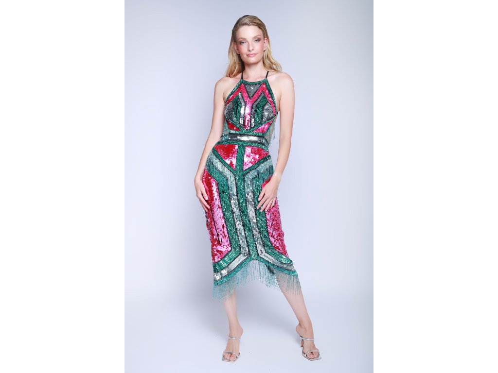 Flitrované barevné asymetrické šaty The Dress ve velikosti XS/S. Výrazný midi střih s třásněmi a originálním designem pro nezapomenutelný koktejl look.