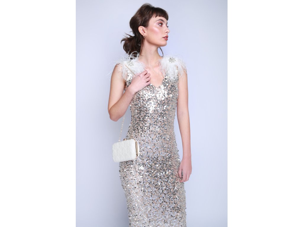 Flitrové šaty s peříčky na ramenou Nadine Merabi