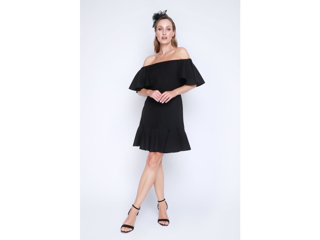 Lehké černé šaty Valentino se spadlými rameny a volánem spojují ženskou eleganci s nenuceným stylem. Ideální pro letní večery i městské procházky.