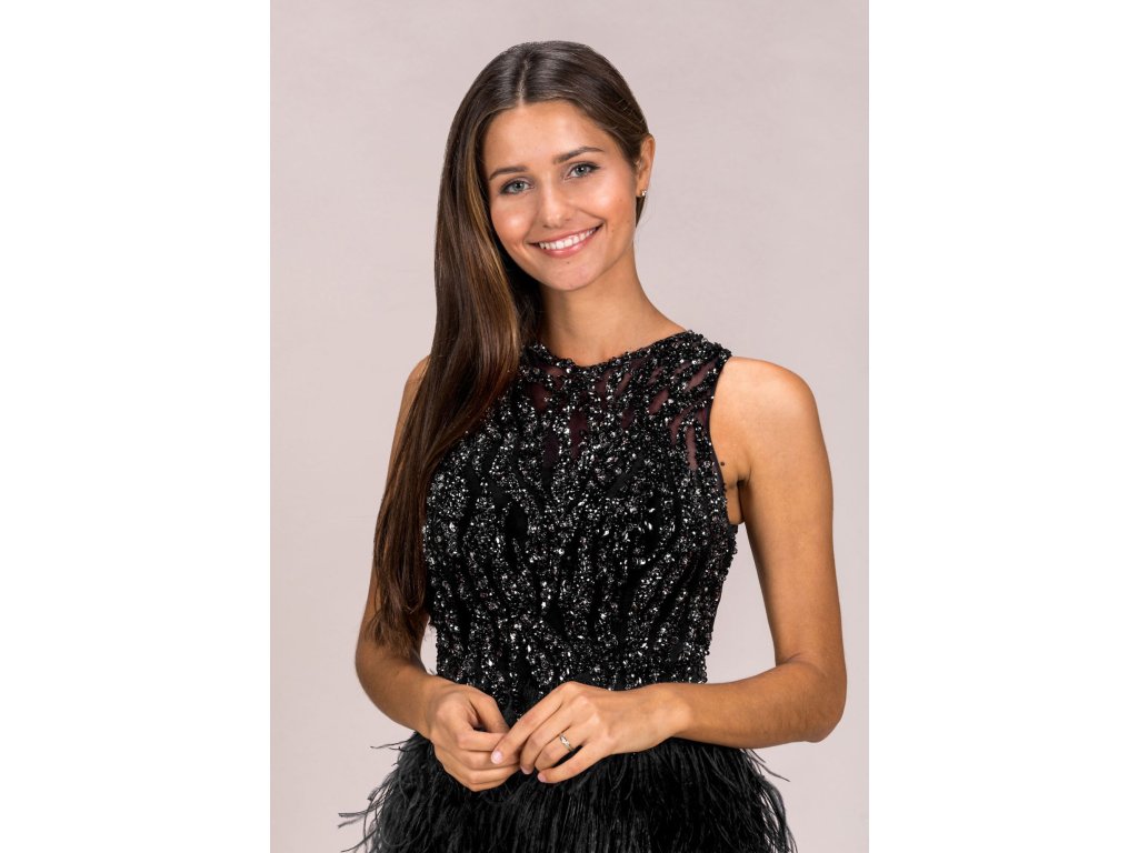 Krátké černé flitrové šaty s peříčky ve velikosti XS/S. Elegantní a originální model, ideální pro večírky a společenské akce s dress codem cocktail.