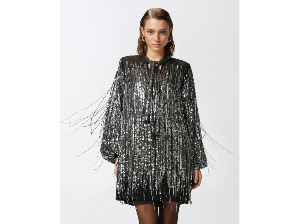 Krátké třpytivé šaty Pinko s třásněmi S/M – výrazný outfit pro cocktail i party večer.