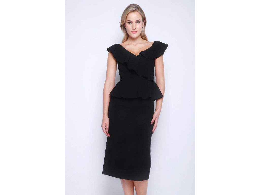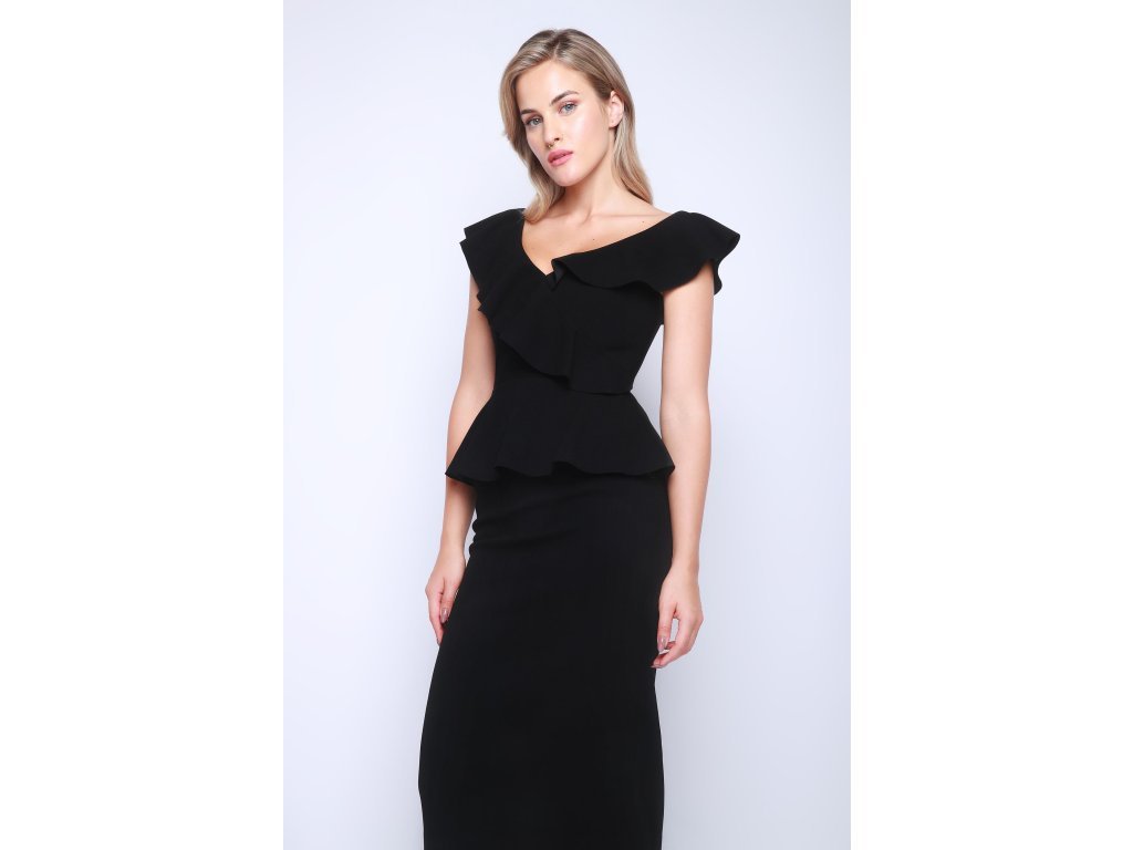 Elegantní černé šaty Rebecca Vallance ve velikosti S/M s volány a peplum střihem, které jsou ideální pro formální večeře nebo do práce.