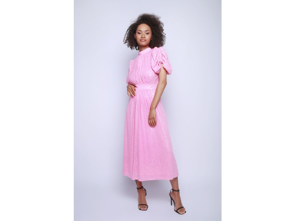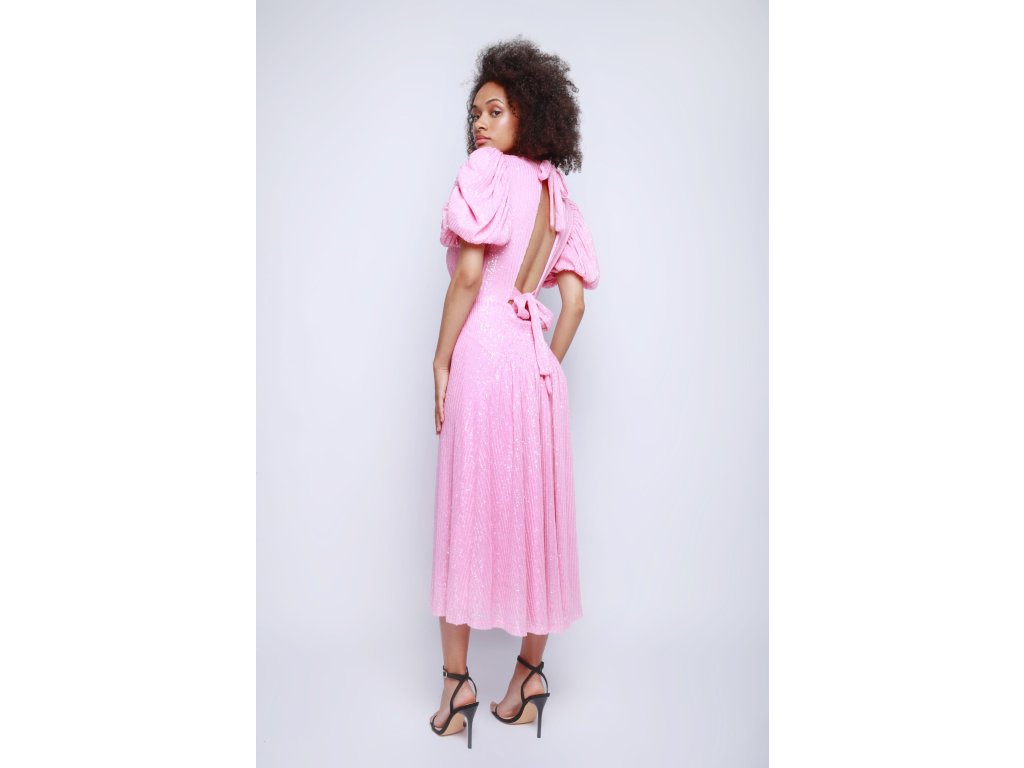 Midi růžové flitrové šaty Rotate M/L s mašličkami – hravé, elegantní a ideální na koktejl.