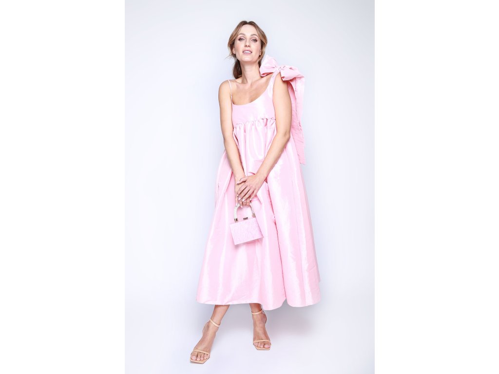 Růžové midi šaty Kika Vargas s mašlí na rameni, romantická volba pro koktejlové akce.