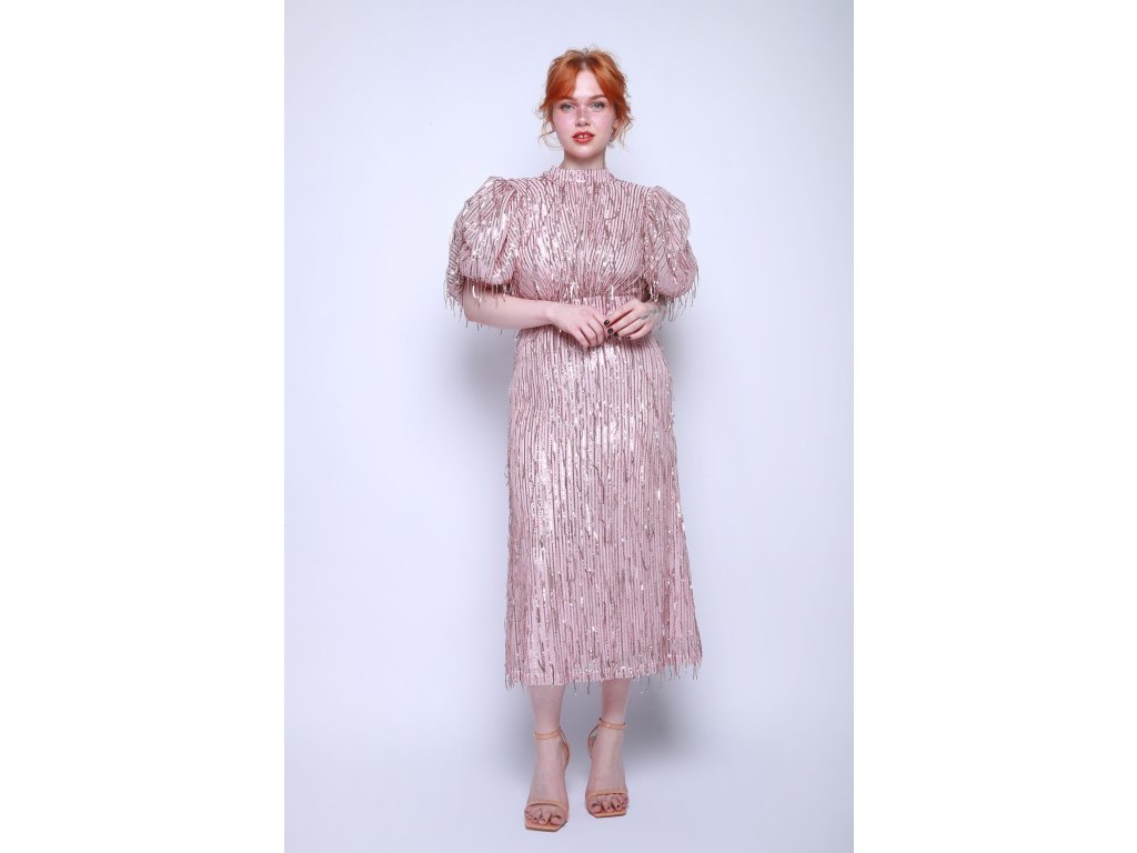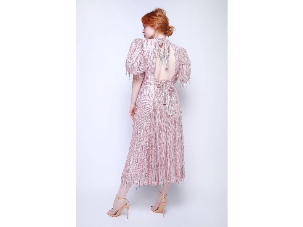 Růžové midi šaty Rotate S/M s třpytivými třásněmi – originální, hravé a ideální na koktejly.