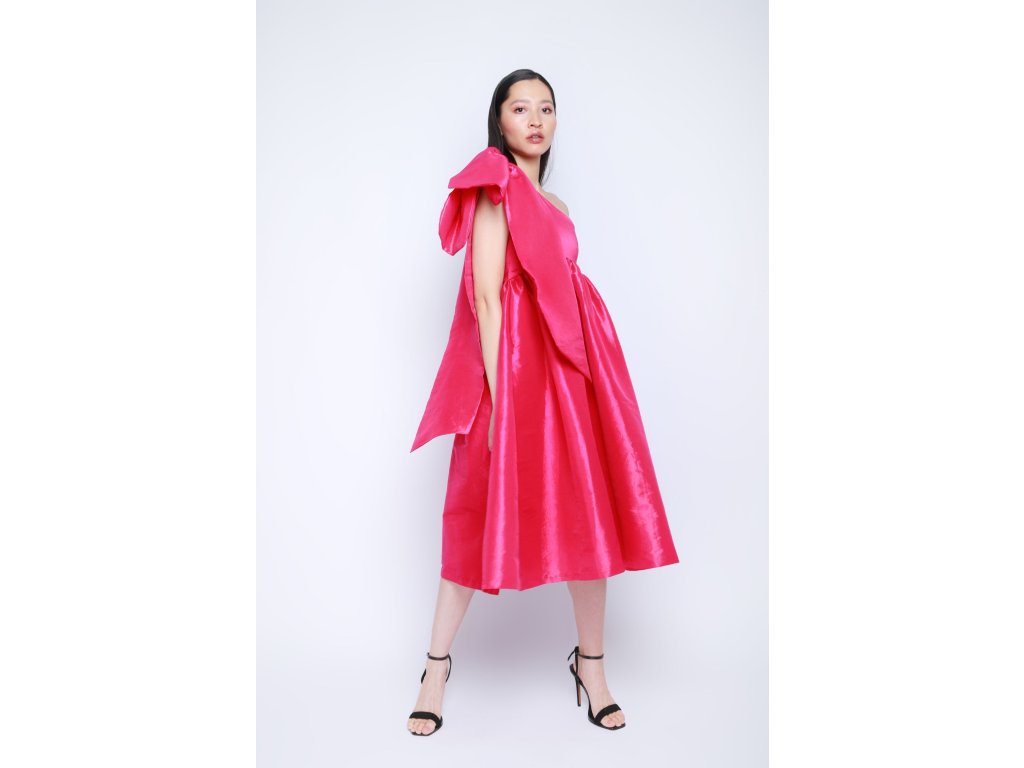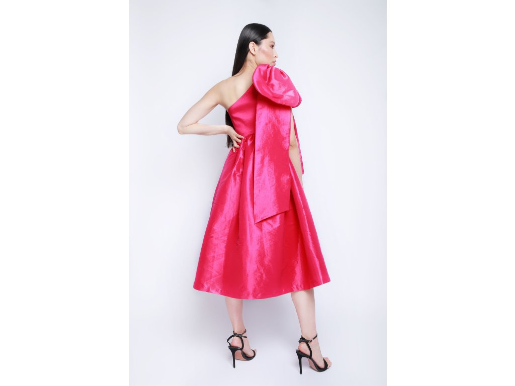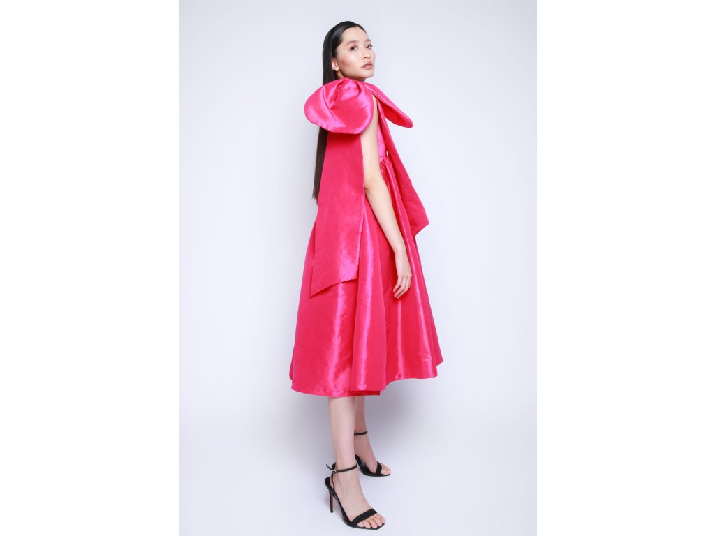 Růžové midi šaty Kika Vargas s výraznou mašlí, originální volba pro koktejlové příležitosti.