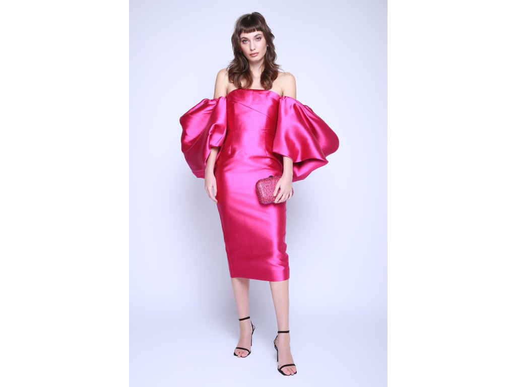 Růžové midi šaty Solace London ve velikosti XS/S jsou extravagantním kouskem, který zaručeně upoutá pozornost. Výrazné balónové rukávy s odhalenými rameny vytvářejí dramatický efekt, zatímco přiléhavý střih krásně zvýrazní siluetu. Sytě růžová barva dodává šatům energii a ženskost, díky čemuž jsou ideální volbou pro večírky či události s cocktail dress codem. Tento model je spojením originality, elegance a odvážného designu – perfektní pro ženy, které chtějí být nepřehlédnutelné.