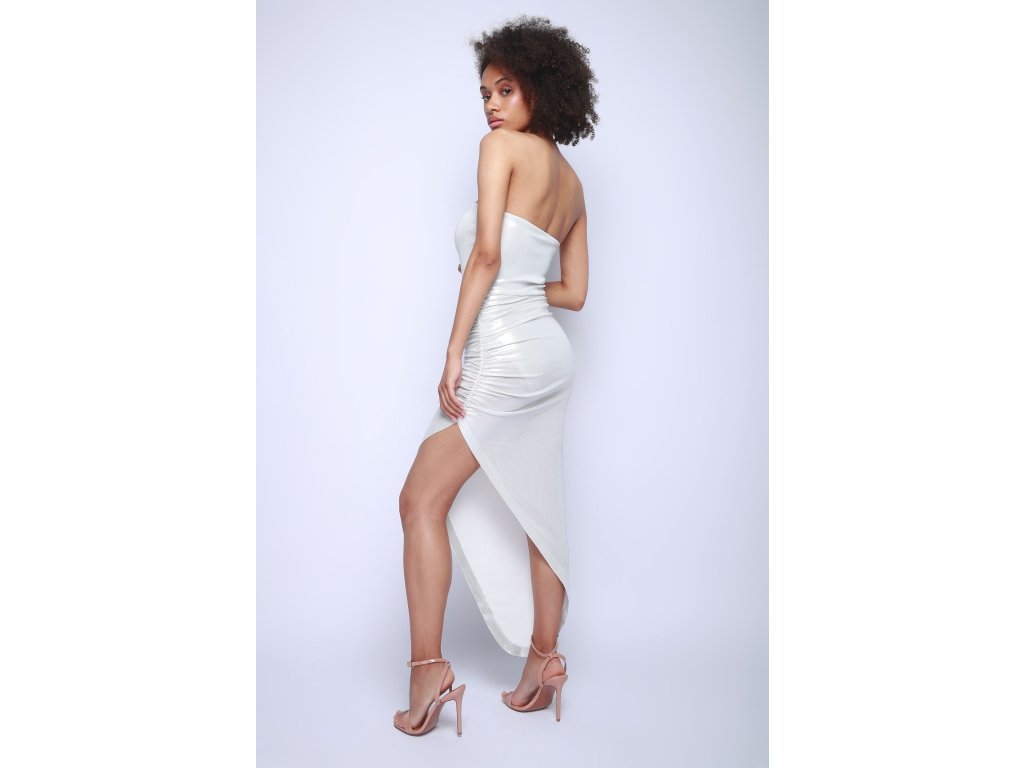 Stříbrné asymetrické midi šaty Norma Kamali XS/S – elegantní volba na večírky a party.